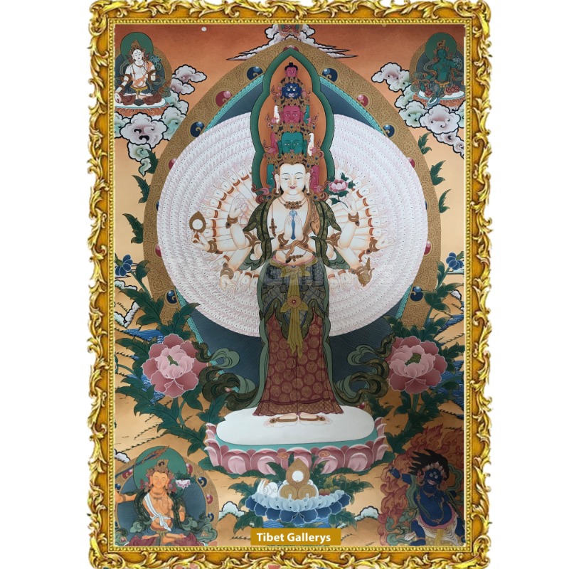 The Thousand- armed Avalokiteshvara is standing on a lotus base,
