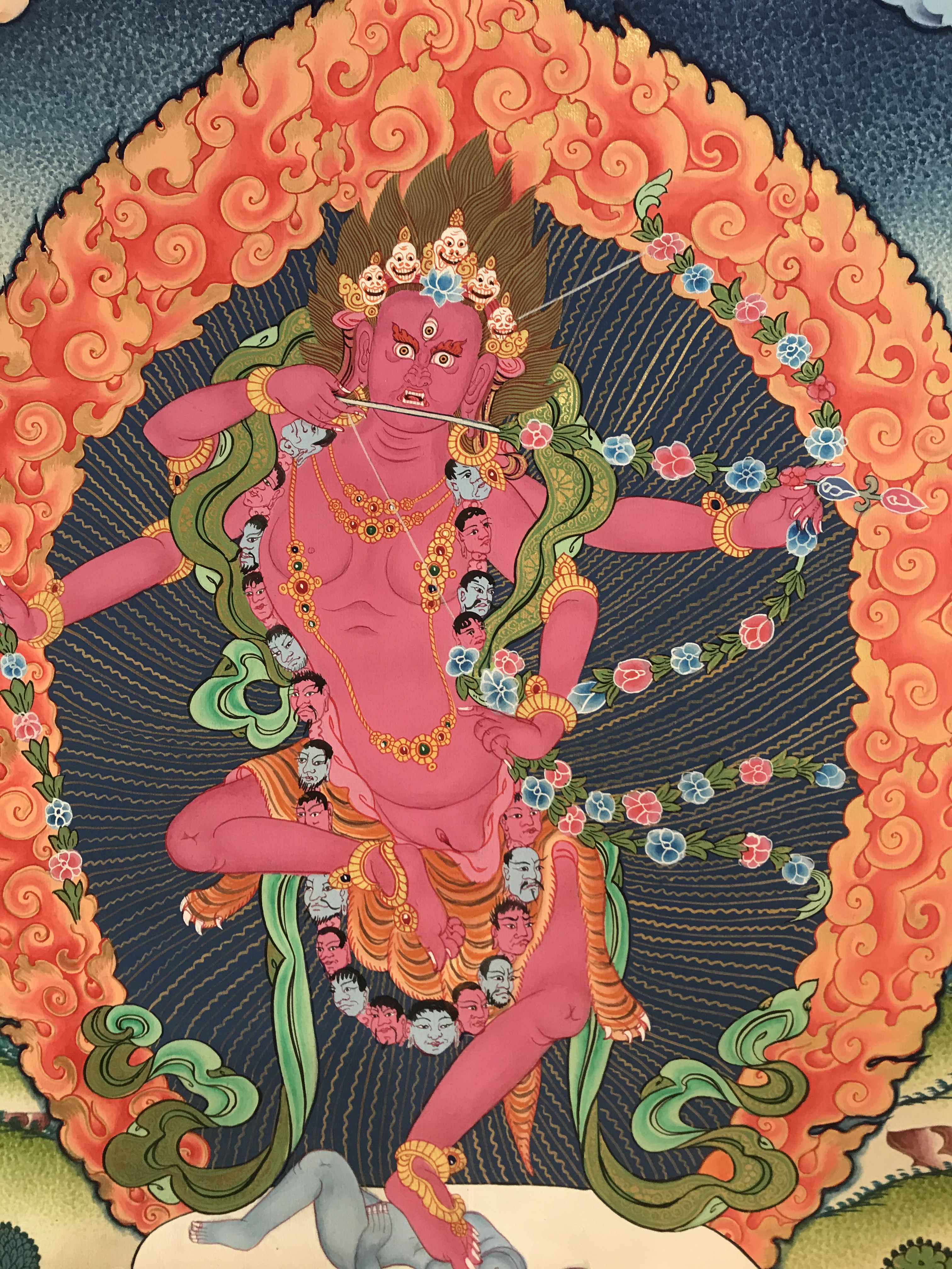 the centre of this Thangka a vivacious Kurukulla with four arms dances on the