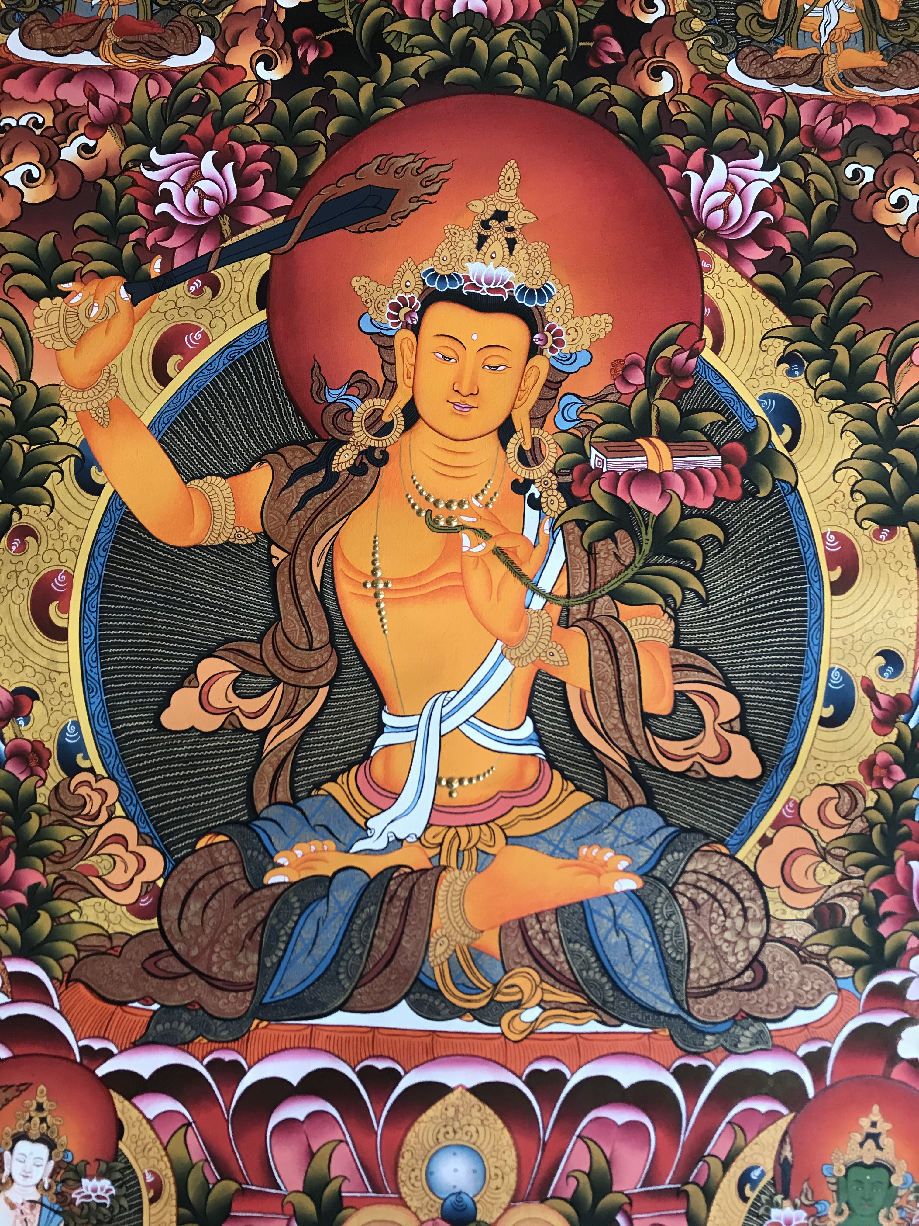 Manjushri is a beautiful male youth, a golden orange