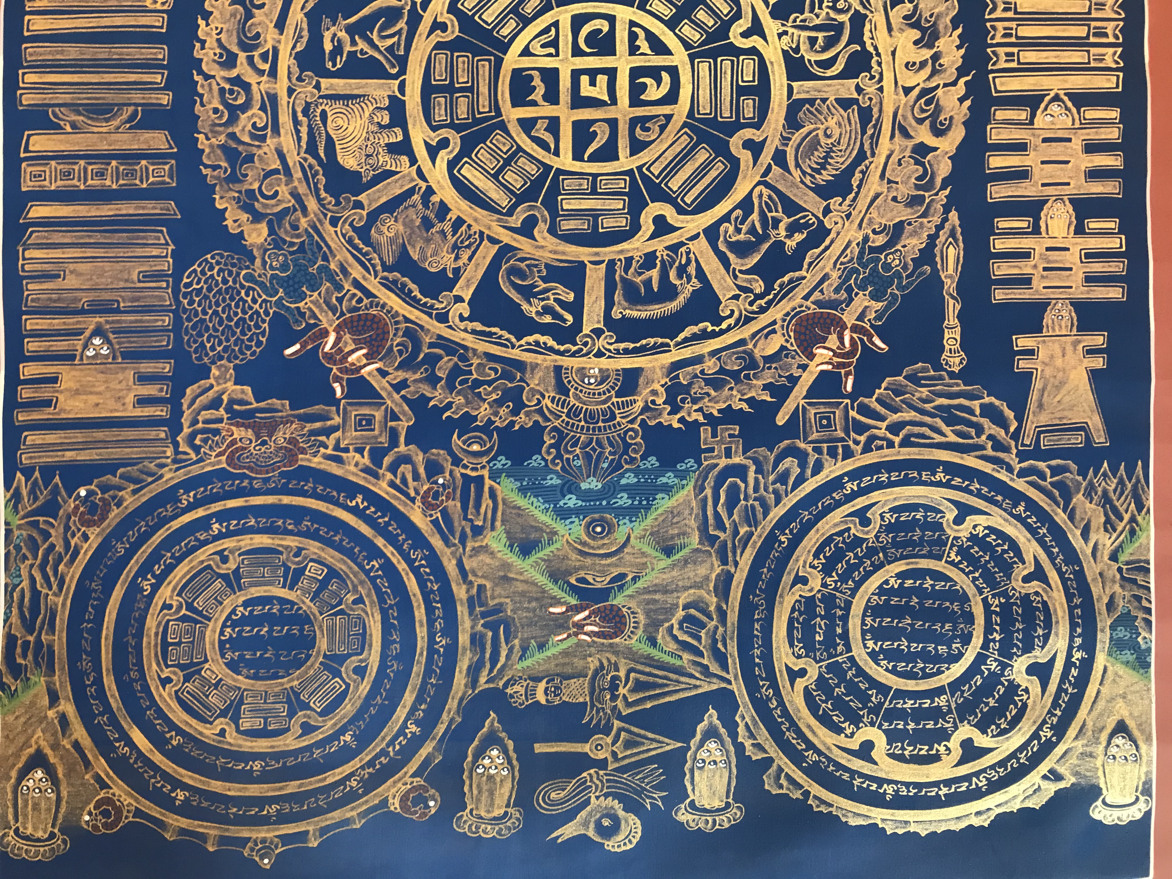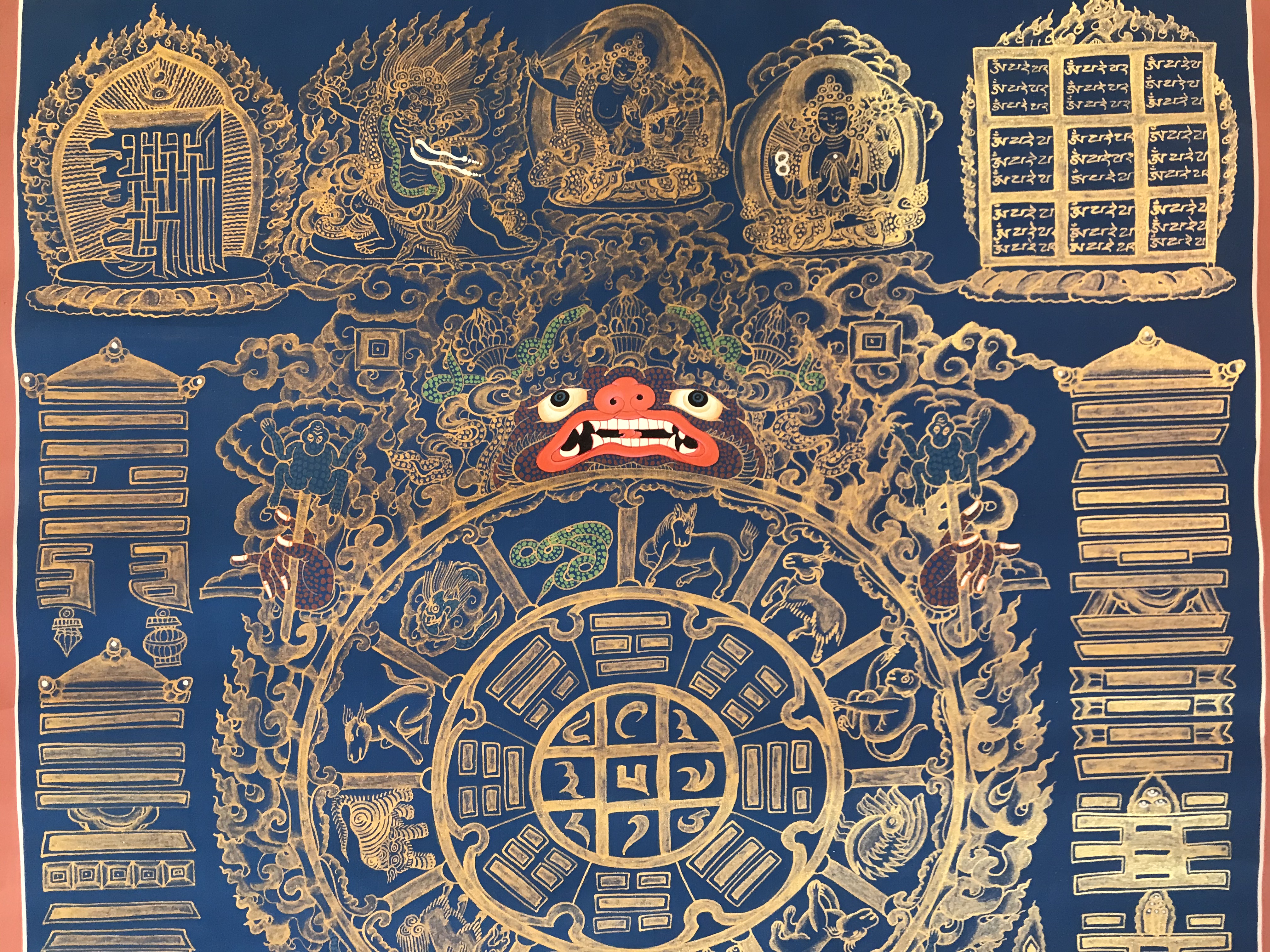 apart. At the top right of the thanka, out of Yama's sight, is a Buddha figure