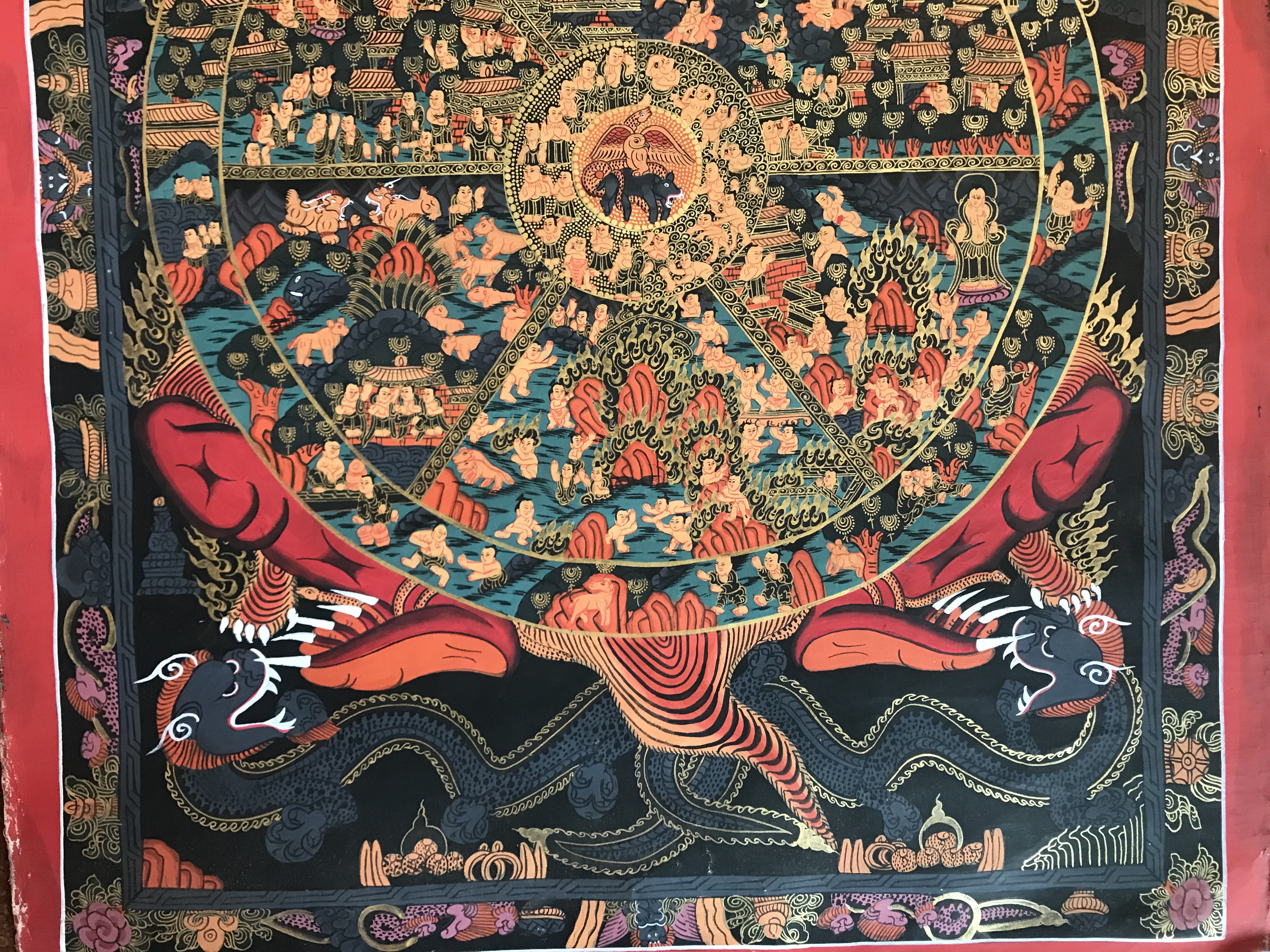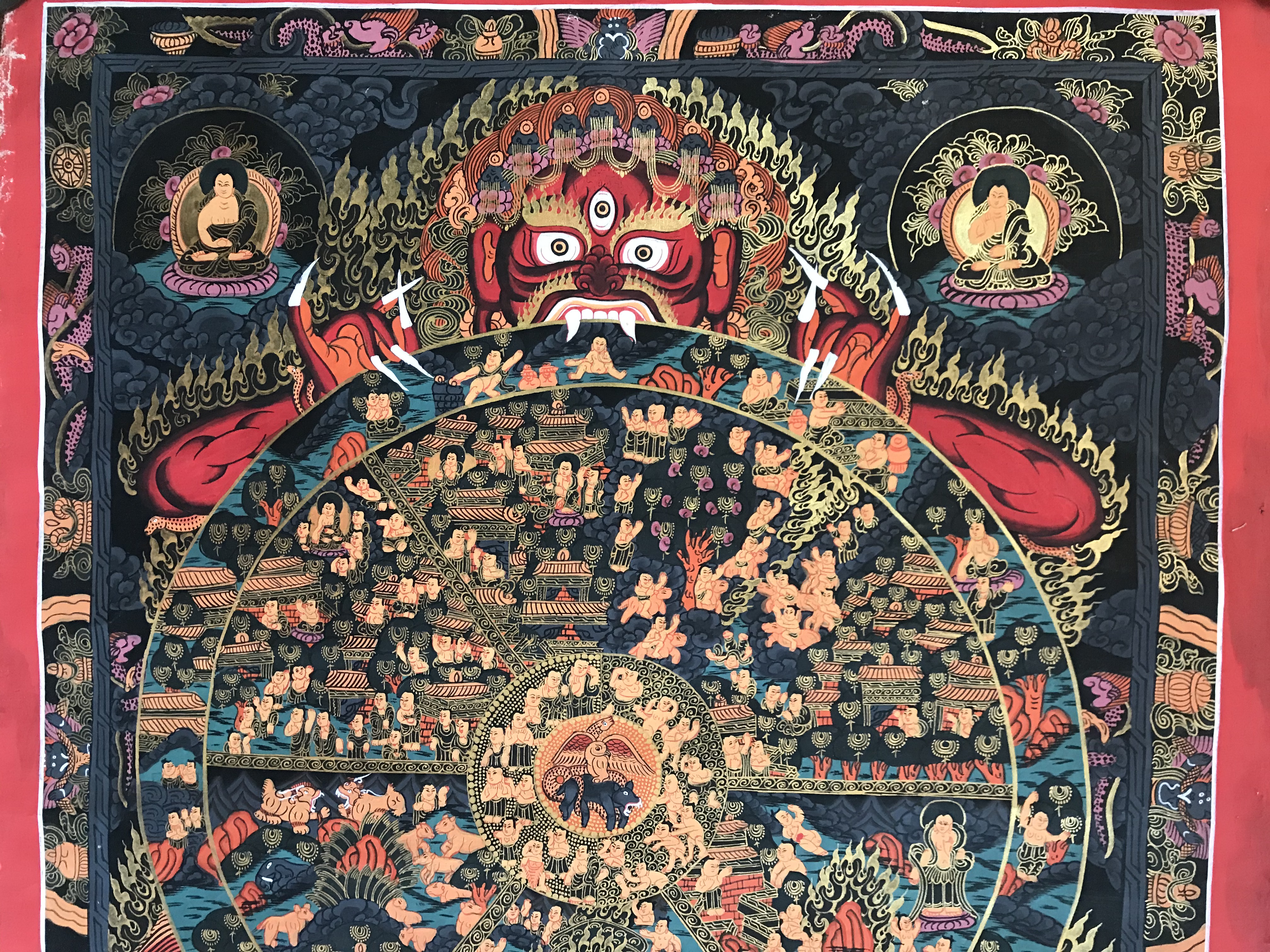 apart. At the top right of the thanka, out of Yama's sight, is a Buddha figure