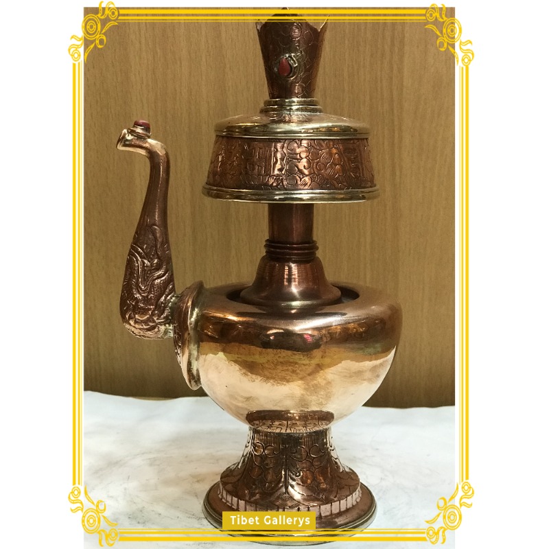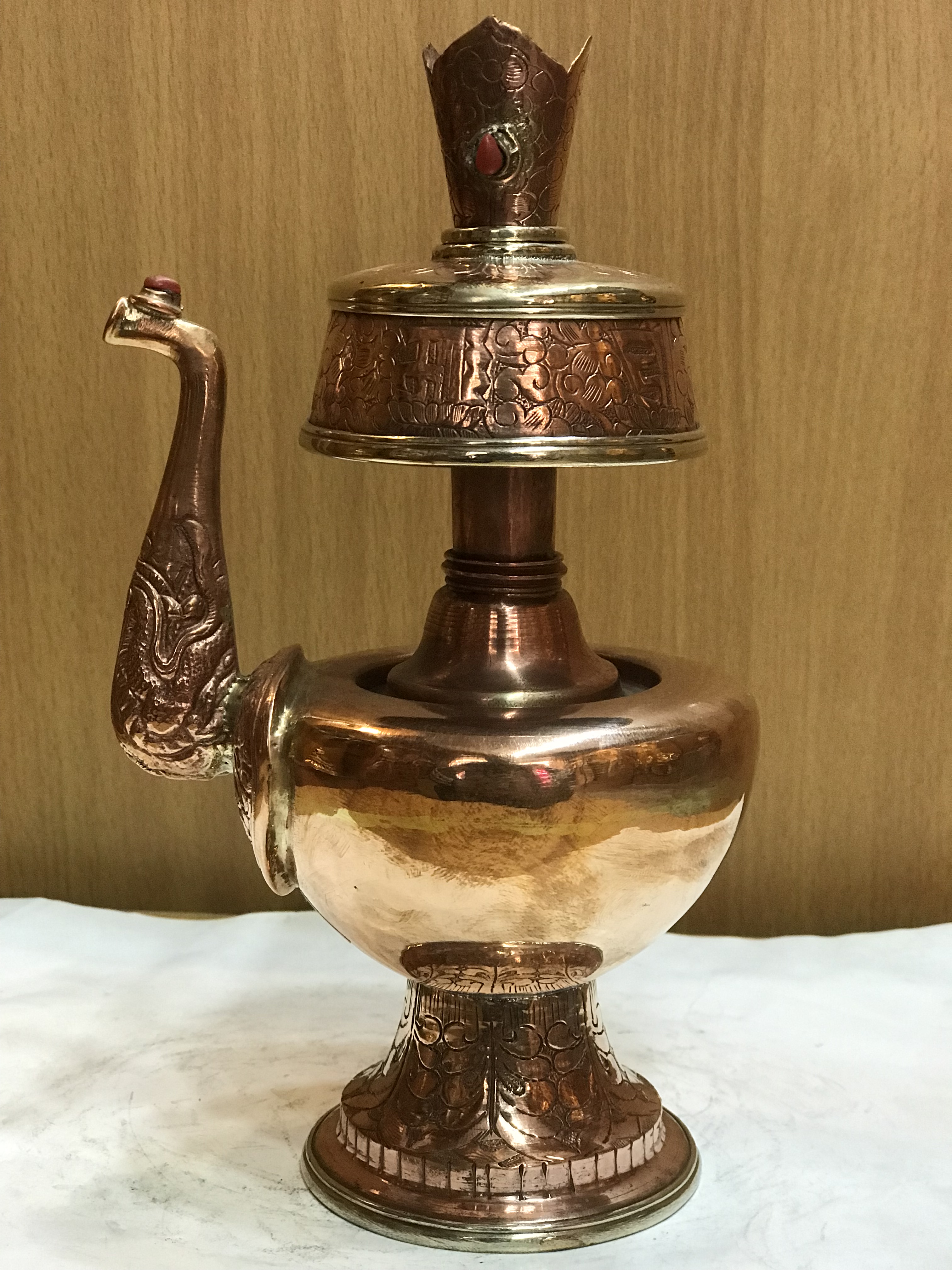 These Bhumpa vases are the best examples of high quality ritual instruments crafted in Nepal in the purest tradition of Tibetan Buddhism rituals. It is a very fine hand hammered copper object that displays beautiful engraving and detailed metalwork to the raised base, the top and the spout. All ritual objects of "Monastery Quality" it is from the best Nepalese craftsmen and have been carefully selected by a master of Buddhist rituals.
