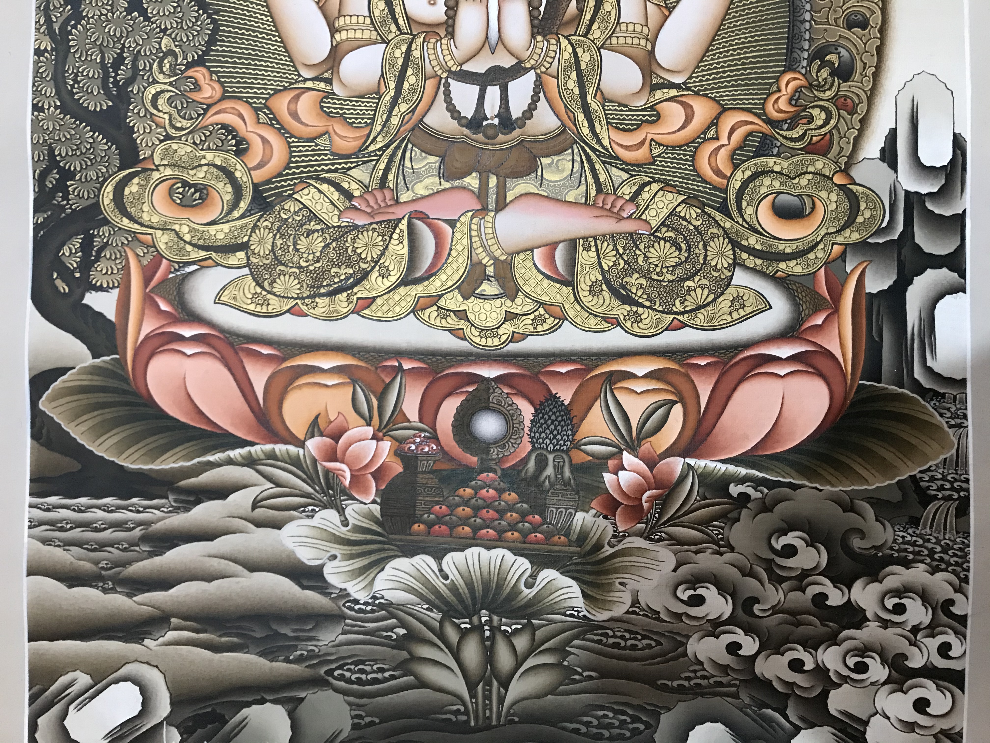 lotus flower and in his right hand, a crystal mala, which he is using to count