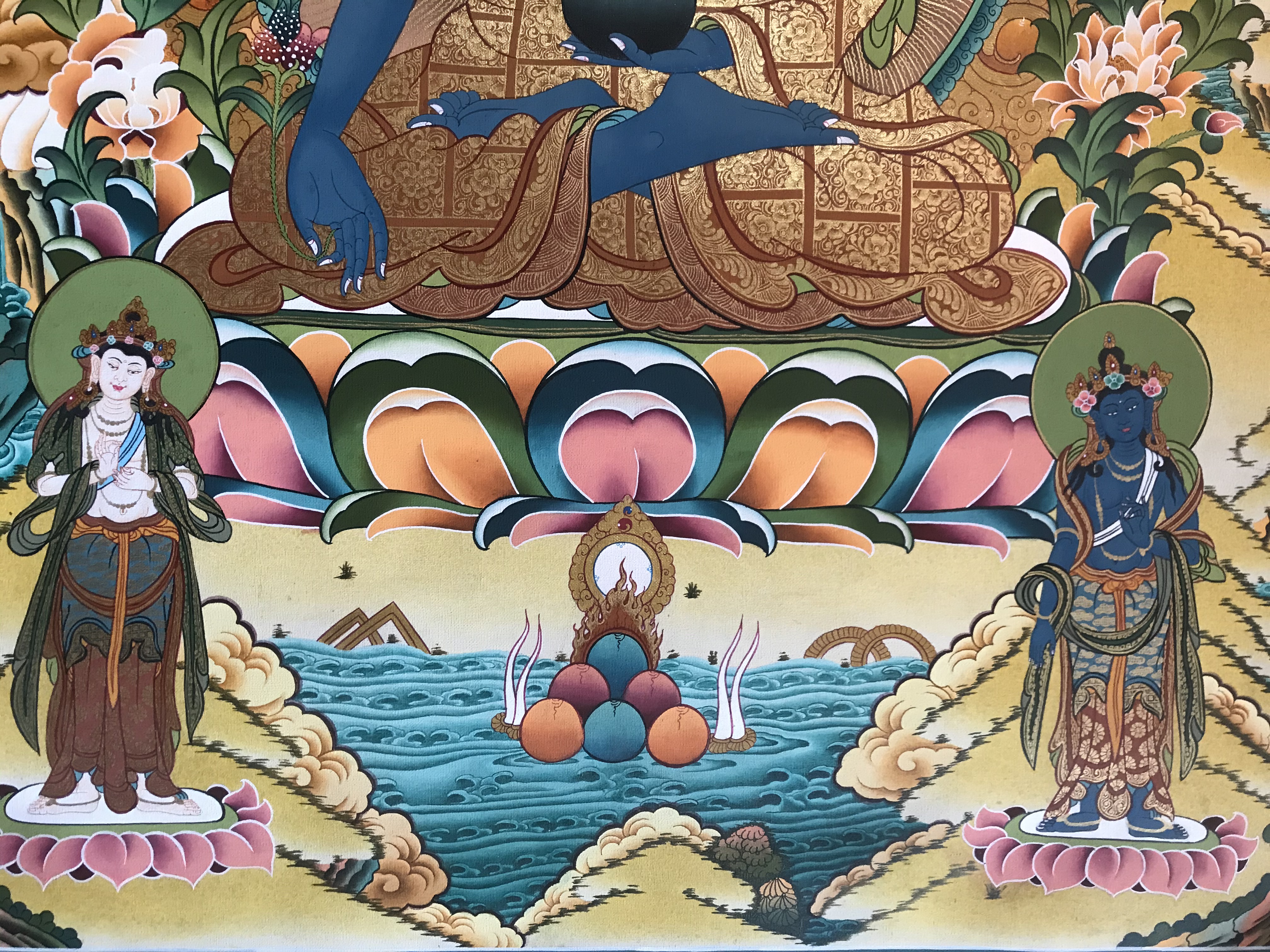 above him are five Buddhas and other celestial beings. Below are fearful