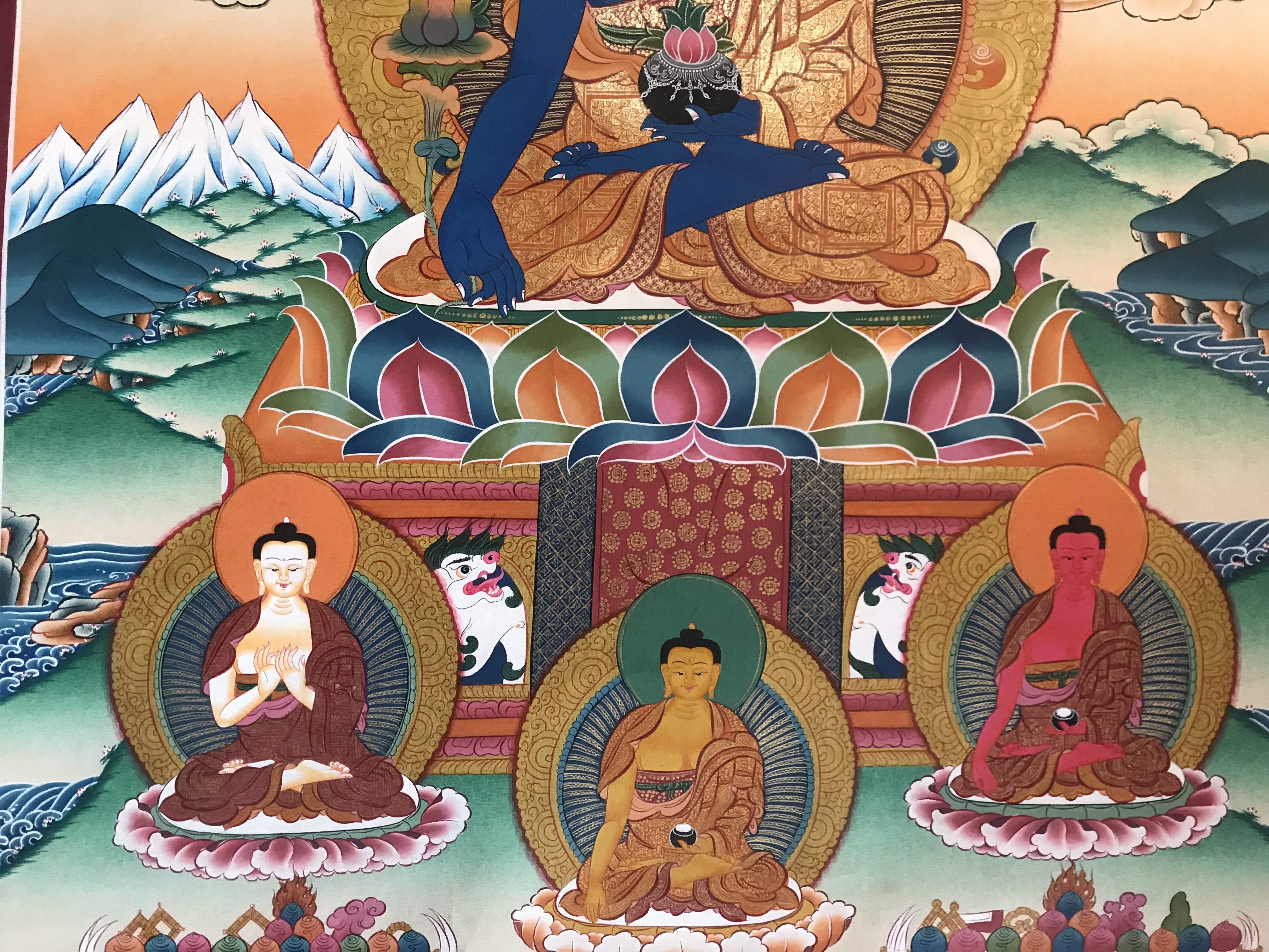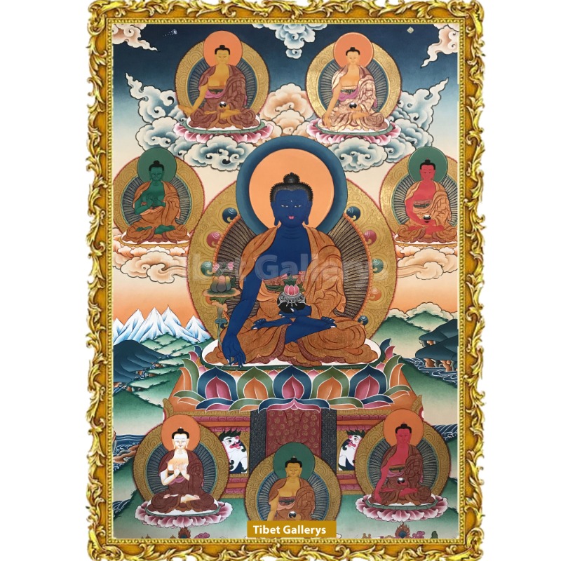 The Buddha – our enlightened essence – is known as the great healer, the energy which releases all beings from affection. According to the Tibetan tradition, the Buddha emanated as Bhaishajyaguru, the "master of remedies," thousands of years ago. He established the Tibetan medical tradition in the form of texts known as The Four Tantras of Secret Instructions on the Eight Branches of the Essence of Immortality, which are more commonly referred to as Gyushi, "The Four Medical Tantras." The master of remedies holds in his right hand a spring of aurora, or cherubic Myrobalan, from which much of Tibetan medicine is compounded. His hand faces outward, symbolizing his bestowal of boons. In his left hand he holds a bowl containing three forms of ambrosia: the nectar that cures disease and resurrects the dead; the nectar that counteracts aging; and the supreme nectar that illuminates the mind increases knowledge. The Tibetan psysian yeshi Donden explained: Bhaishajyaguru is blue in colour like the sky; his body is clear when looking from the outside and clear when looking outward from inside... Look carefully at how he is sitting, the shape of his eyes, the gesture that his hands are displaying... and think about his qualities and altruistic activities...Imagine that light rays spread out from the heart...radiating in the ten directions, entering into the four elements, and turning them into highly potential medicines. These light rays return and dissolve into the medicines in Bhaishajyaguru's begging bowl. This is how the power of mantra and meditative stabilization affects the potencies of medicines.' The Medicine Buddha's throne is supported by snow lions and flanked by dragons. In the sky above him are five Buddhas and other celestial beings. Below are fearful protectors of the path to wholeness. In the healing practices of Tibetan medicine, the unconscious energies that often sabotage our lives are restored to conscious awareness. When we recognize our inseparability from all life, healing often occurs spontaneously – the expression of natural abundance.