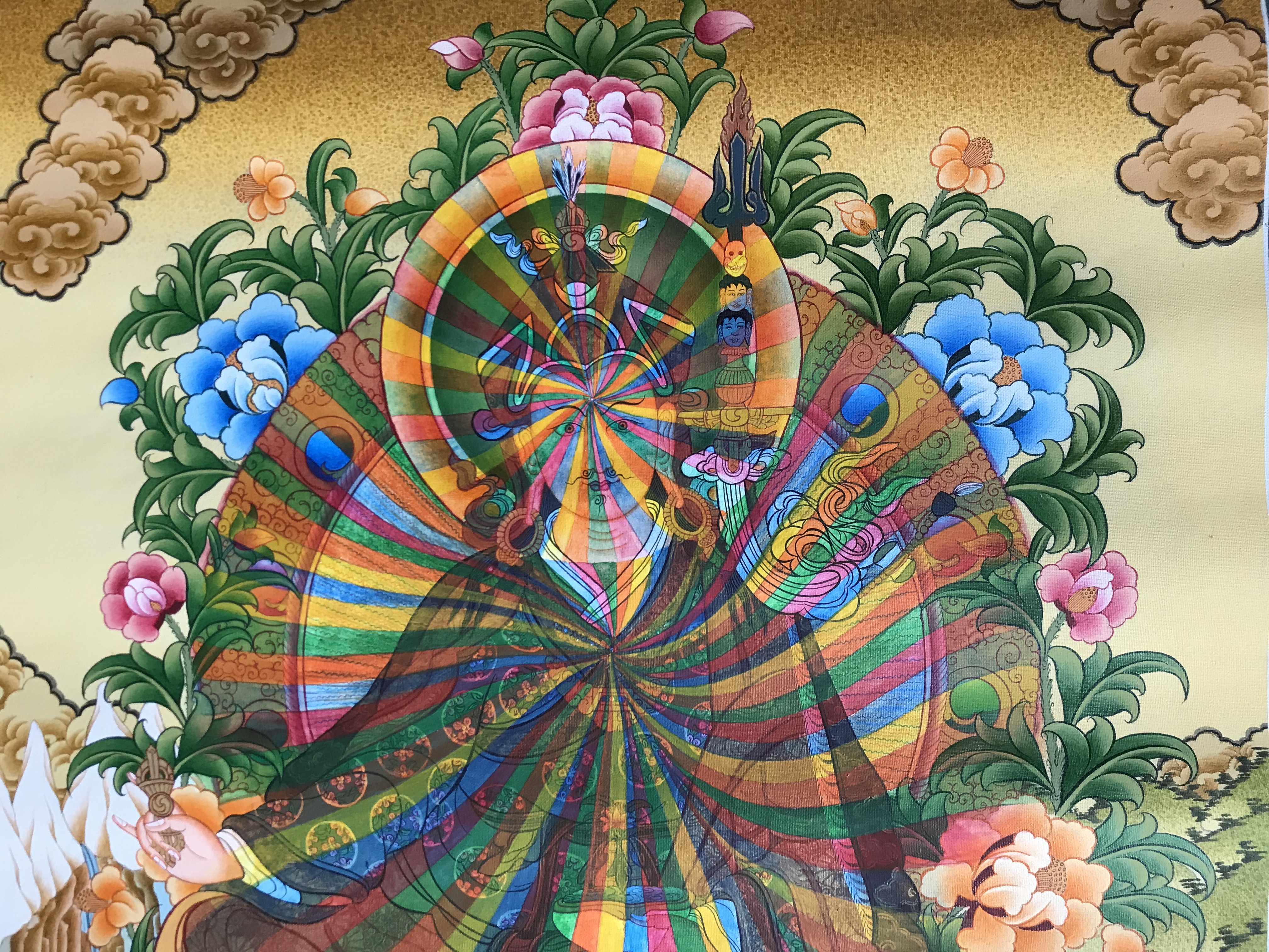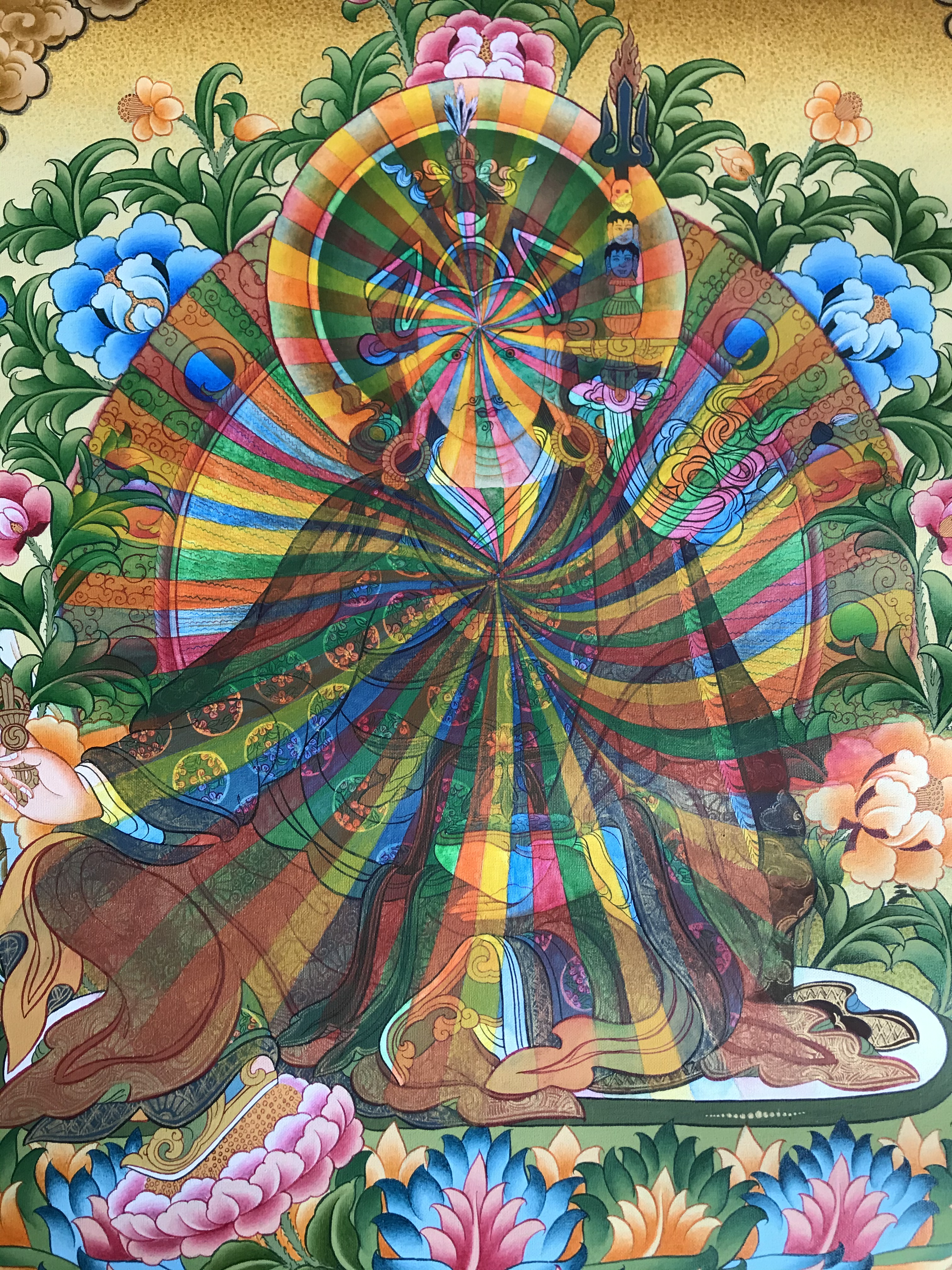 seated on a lotus asana with the legs locked, the right hand holding the vajra