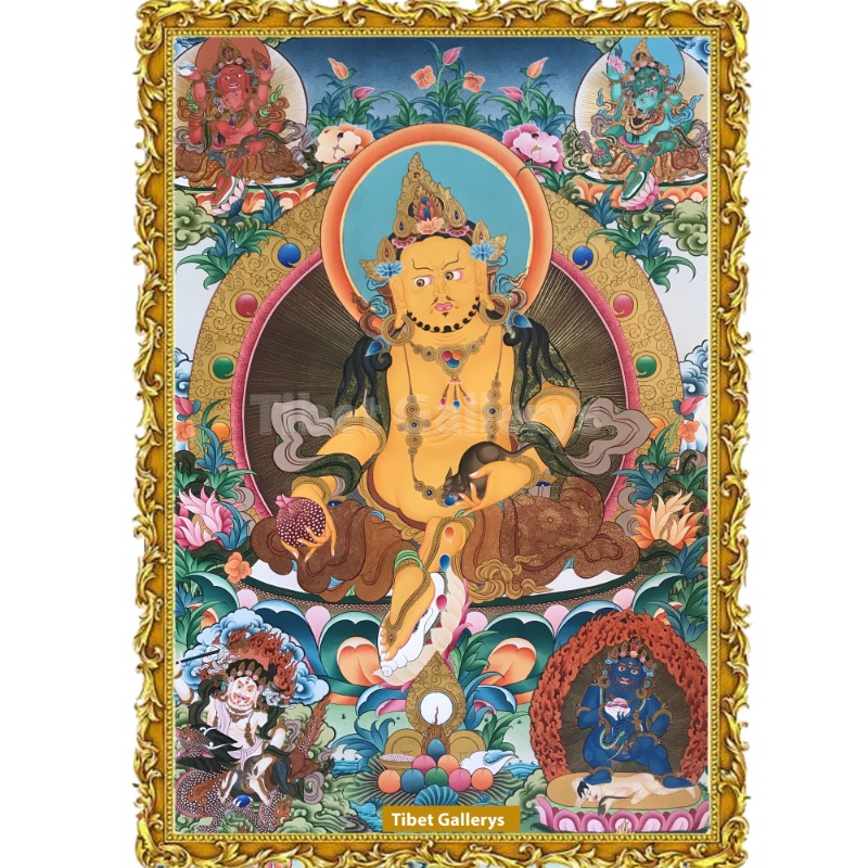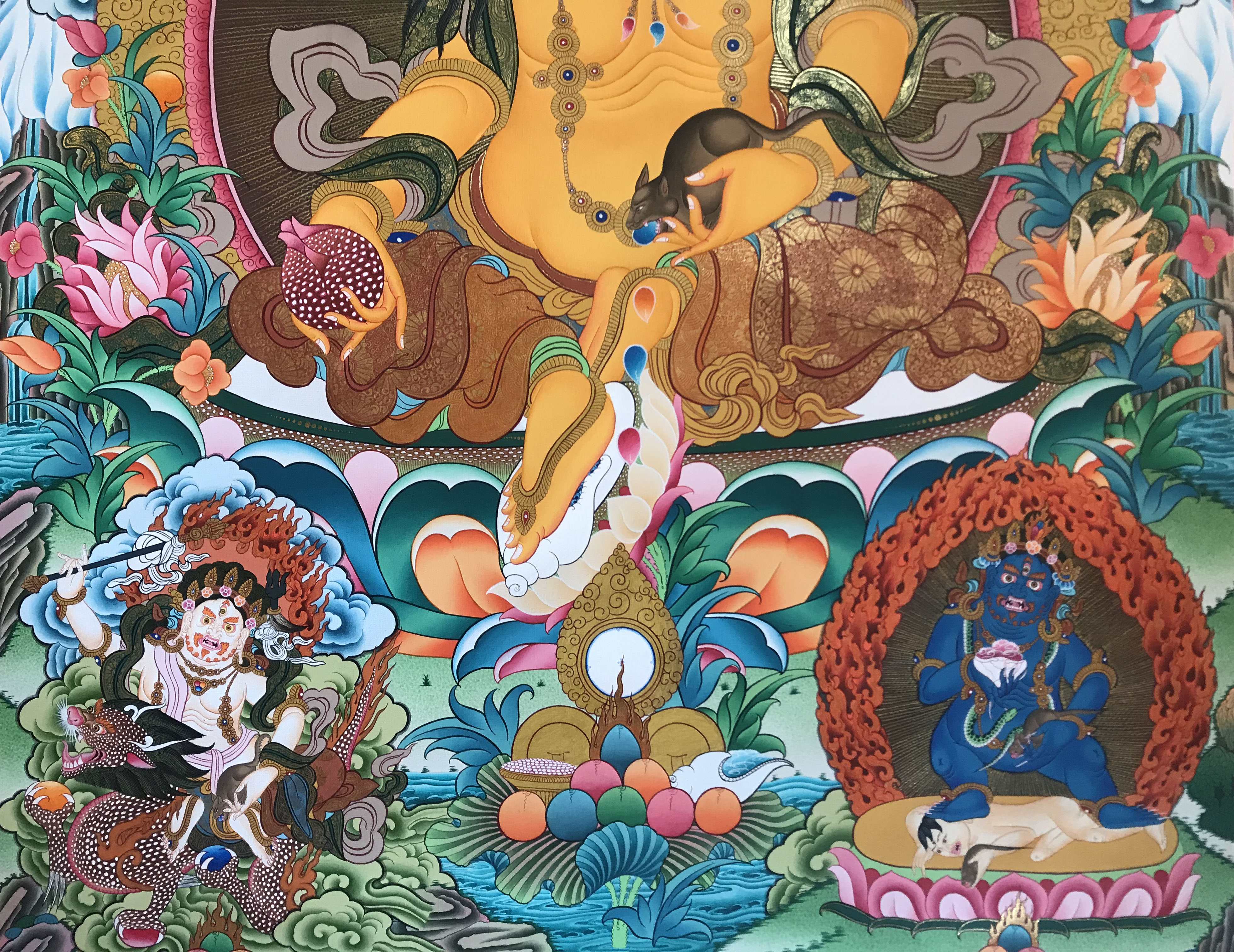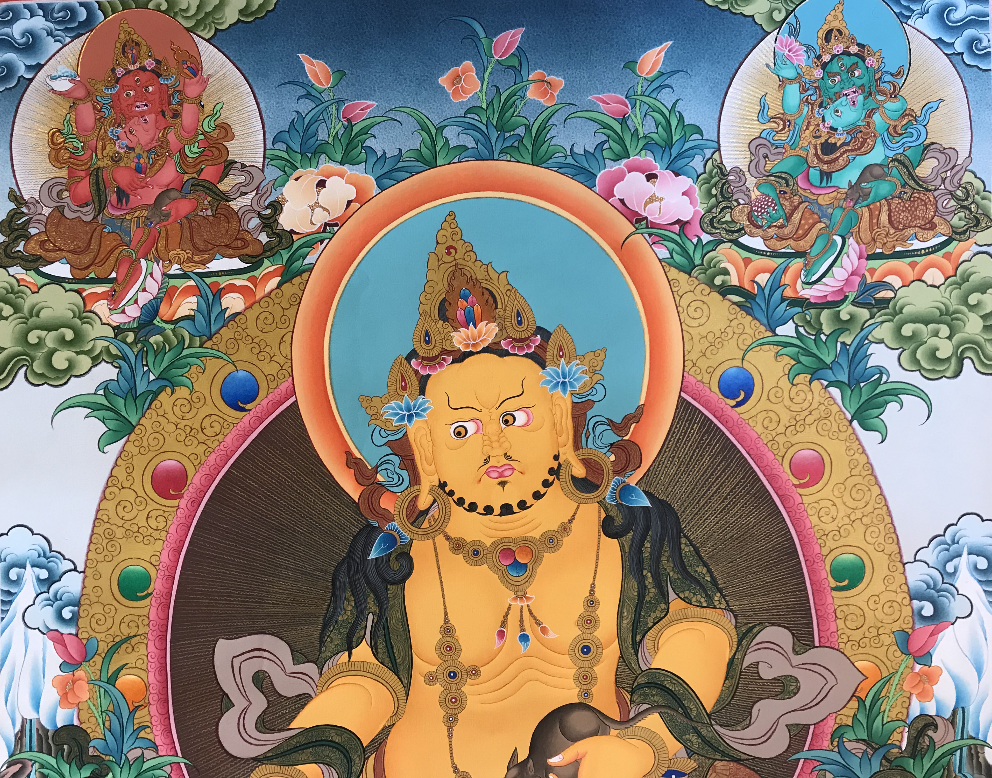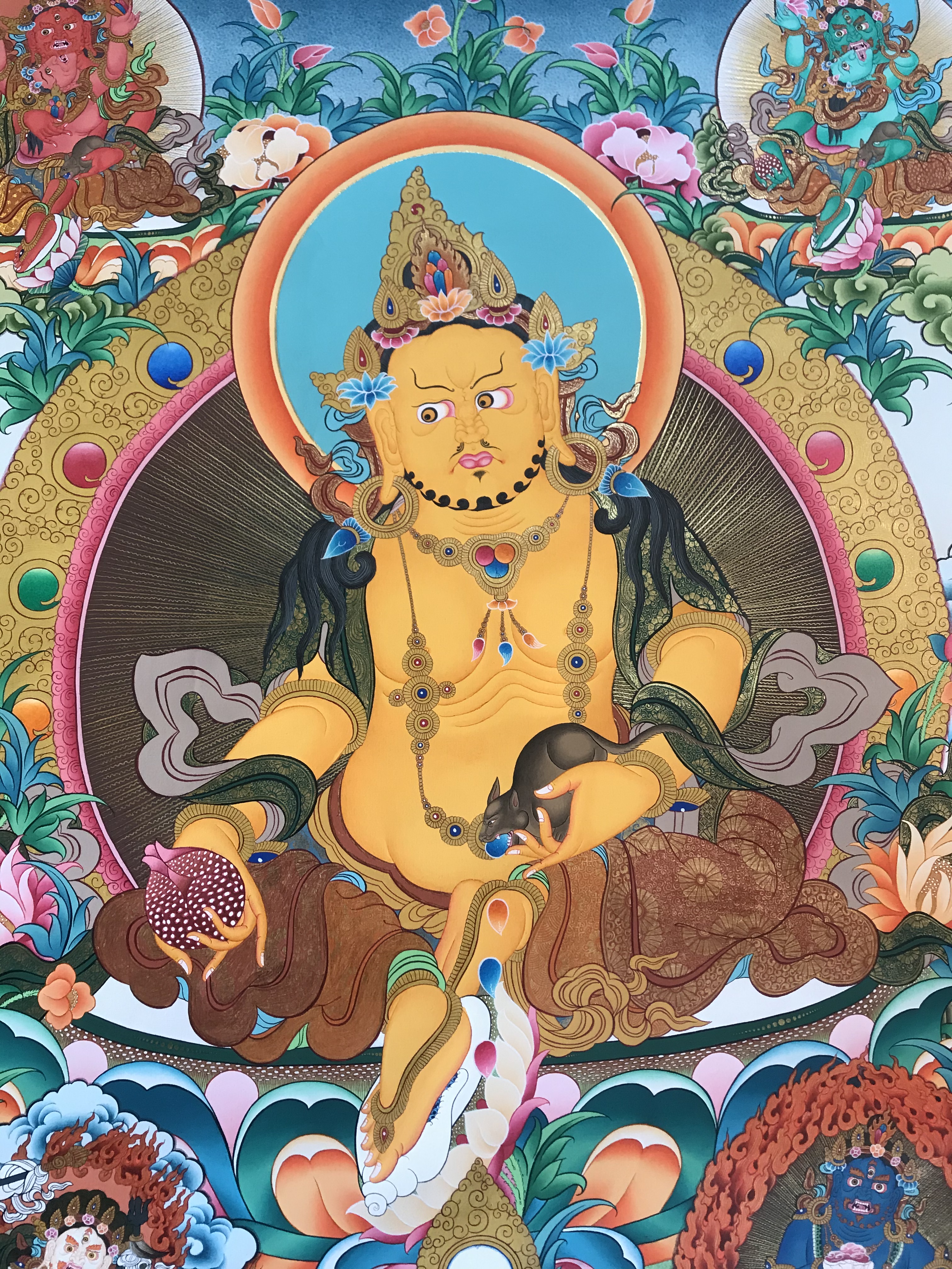 Jambhala is the protector of all linages and of all sentient beings from all sickness and difficulties. Jambhala is a bodhisattva of material and spiritual wealth as well as many other things, especially of granting financial stability. Jambhala is the god of wealth an appropriately a member of the jewel family. In Hindu mythology, Jhambhala is also known as Kubera. Jambhala is also believed to be an emanation of Avalokiteshavara or Chenrezig, the bodhisattva of compassion. There are five different wealth Jambhala, each has their own practice and mantra to help eliminate poverty and creates financial stability. He is usually shown sitting in the lotus, sun, and the moon disk. As with all of the Jambhala, he holds a mongoose in his left hand which produces jewels to give to the needy