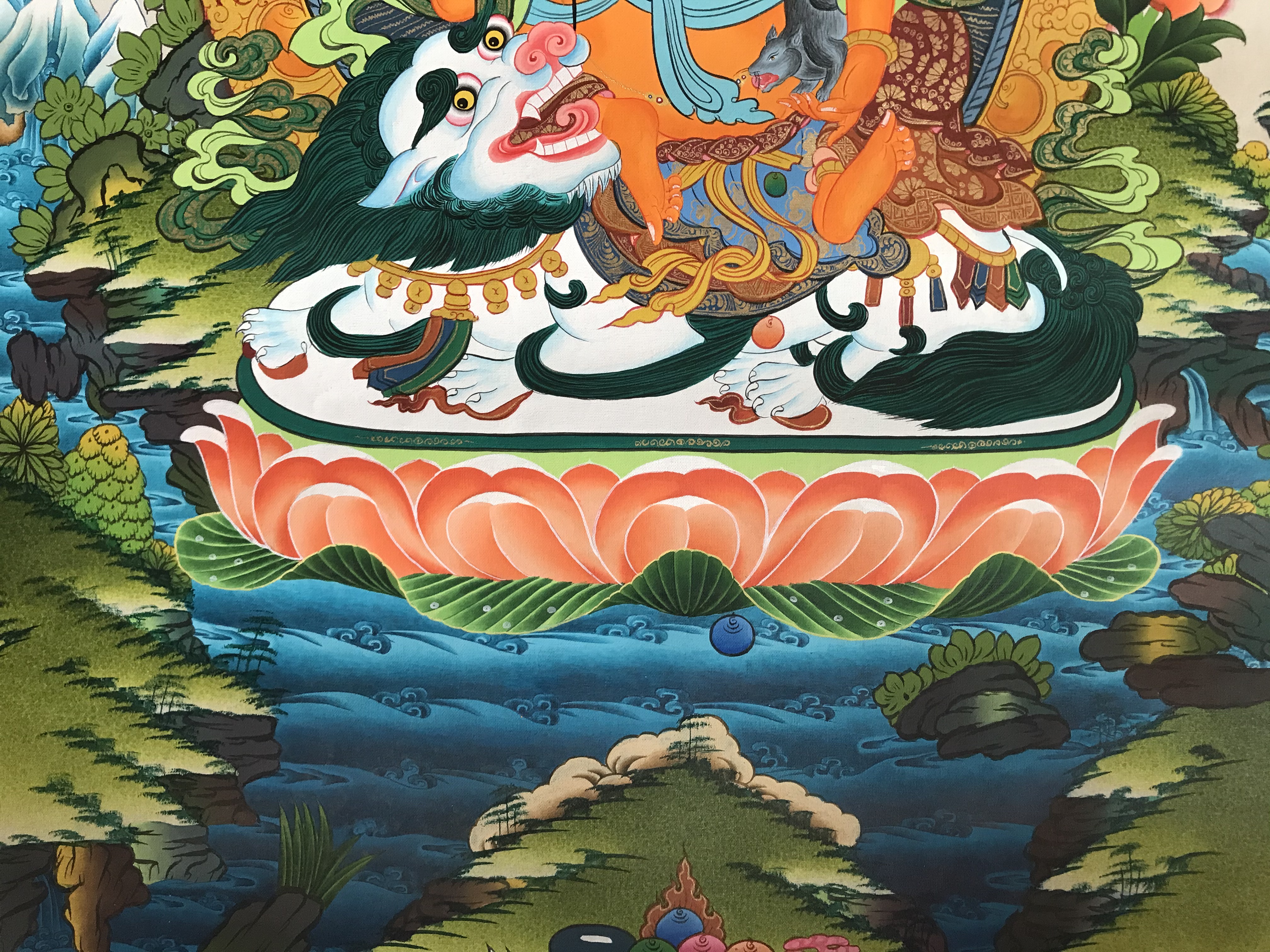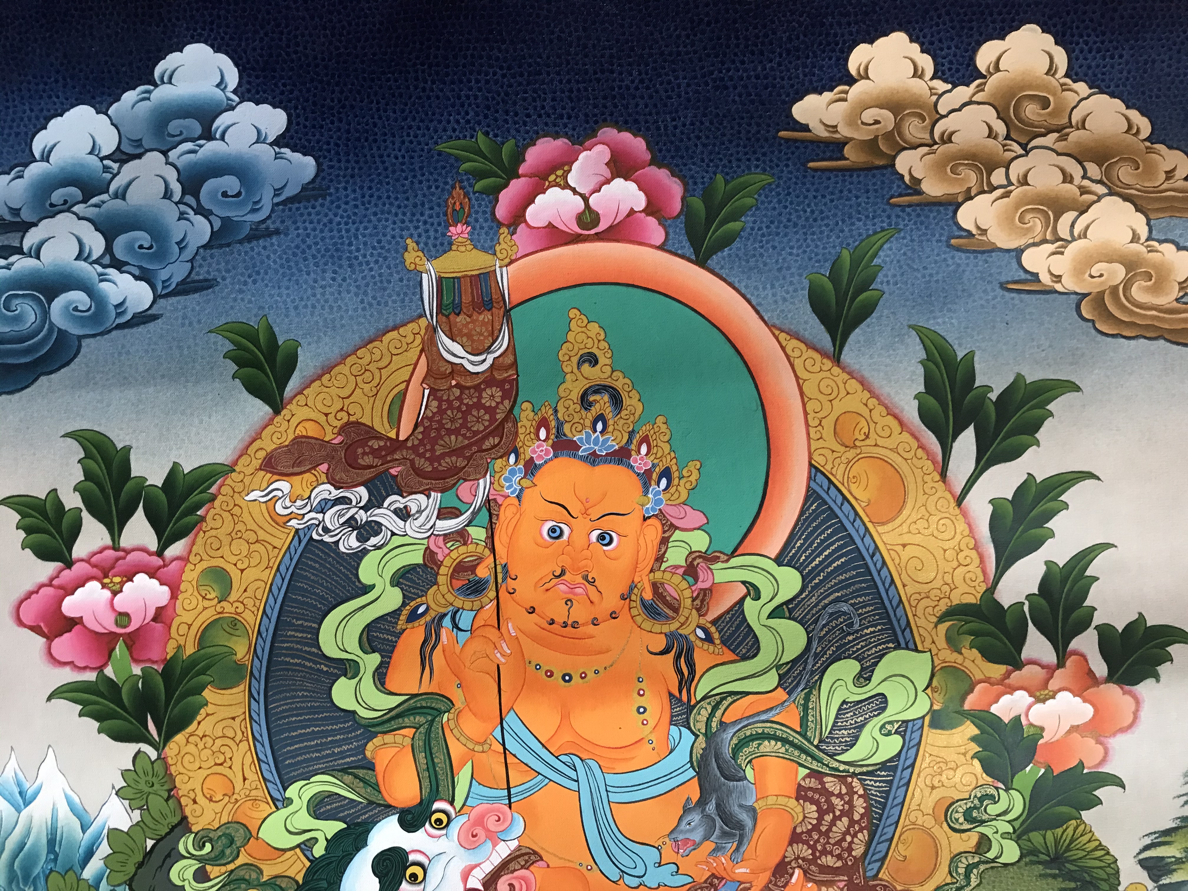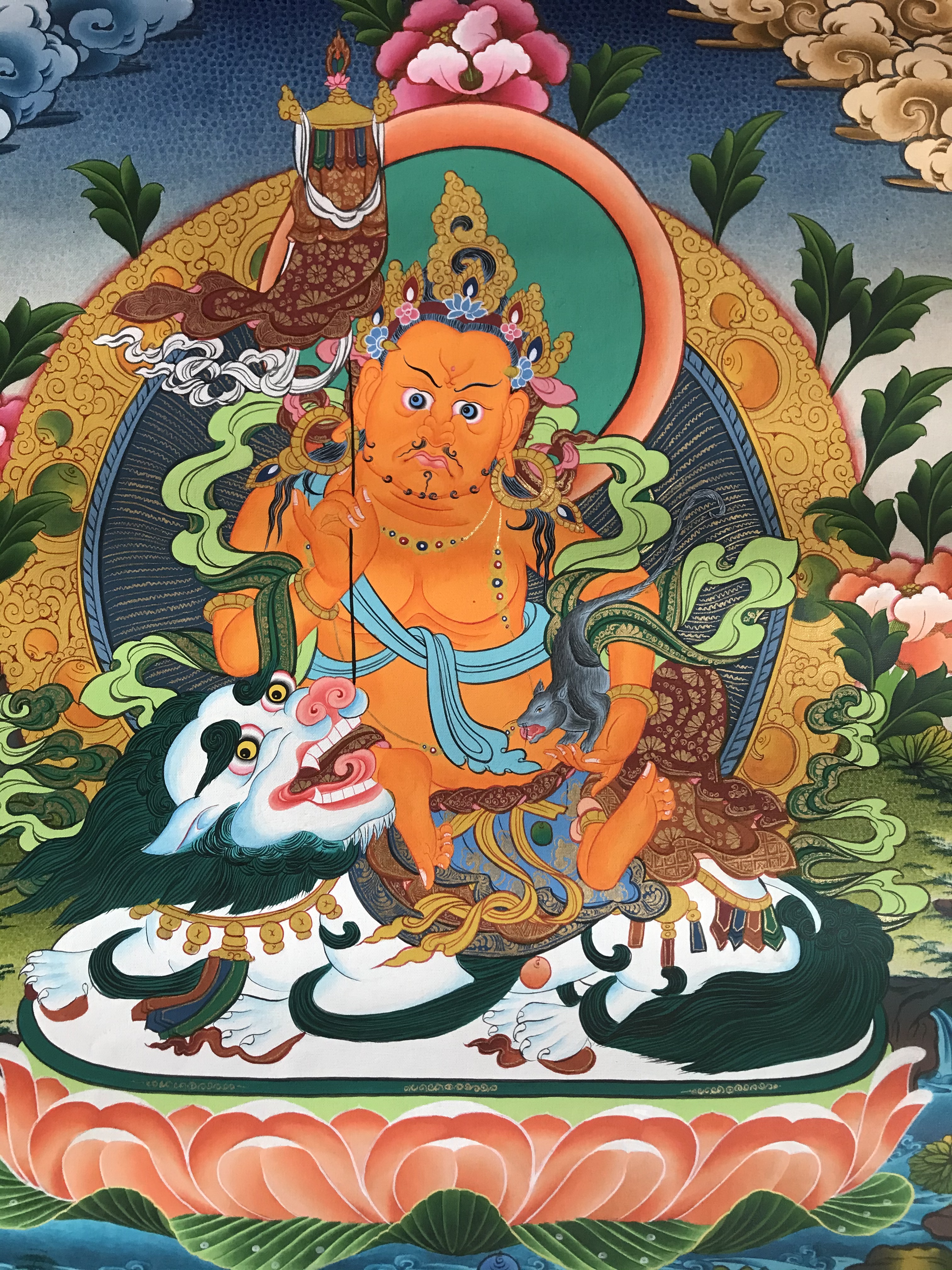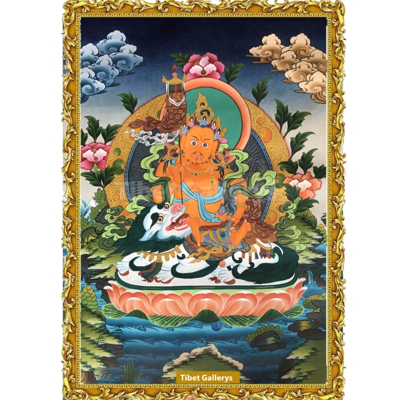 Zambhala is the protector of all linages and of all sentient beings from all sickness and difficulties. Zambhala is a bodhisattva of material and spiritual wealth as well as many other things, especially of granting financial stability. Zambhala is the god of wealth an appropriately a member of the jewel family. In Hindu mythology, Zambhala is also known as Kubera. Zambhala is also believed to be an emanation of Avalokiteshavara or Chenrezig, the bodhisattva of compassion. There are five different wealth Zambhala, each has their own practice and mantra to help eliminate poverty and creates financial stability. He is usually shown sitting in the lotus, sun, and the moon disk. As with all of the Zambhala, he holds a mongoose in his left hand which produces jewels to give to the need