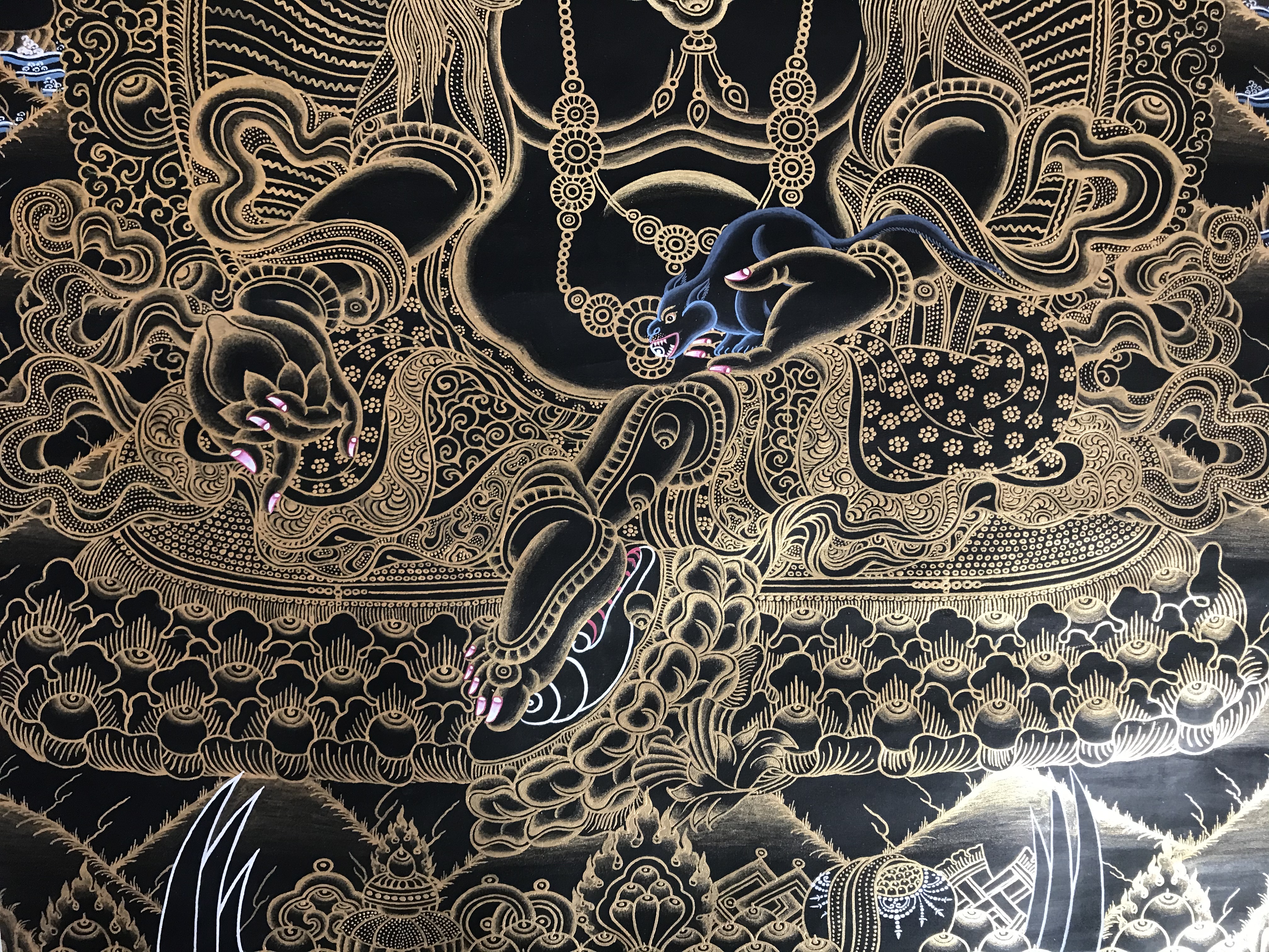 Zambhala is the protector of all linages and of all sentient beings from all sickness and difficulties. Zambhala is a bodhisattva of material and spiritual wealth as well as many other things, especially of granting financial stability. Zambhala is the god of wealth an appropriately a member of the jewel family. In Hindu mythology, Zambhala is also known as Kubera. Zambhala is also believed to be an emanation of Avalokiteshavara or Chenrezig, the bodhisattva of compassion. There are five different wealth Zambhala, each has their own practice and mantra to help eliminate poverty and creates financial stability. He is usually shown sitting in the lotus, sun, and the moon disk. As with all of the Zambhala, he holds a mongoose in his left hand which produces jewels to give to the need