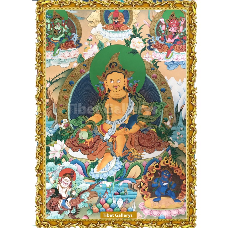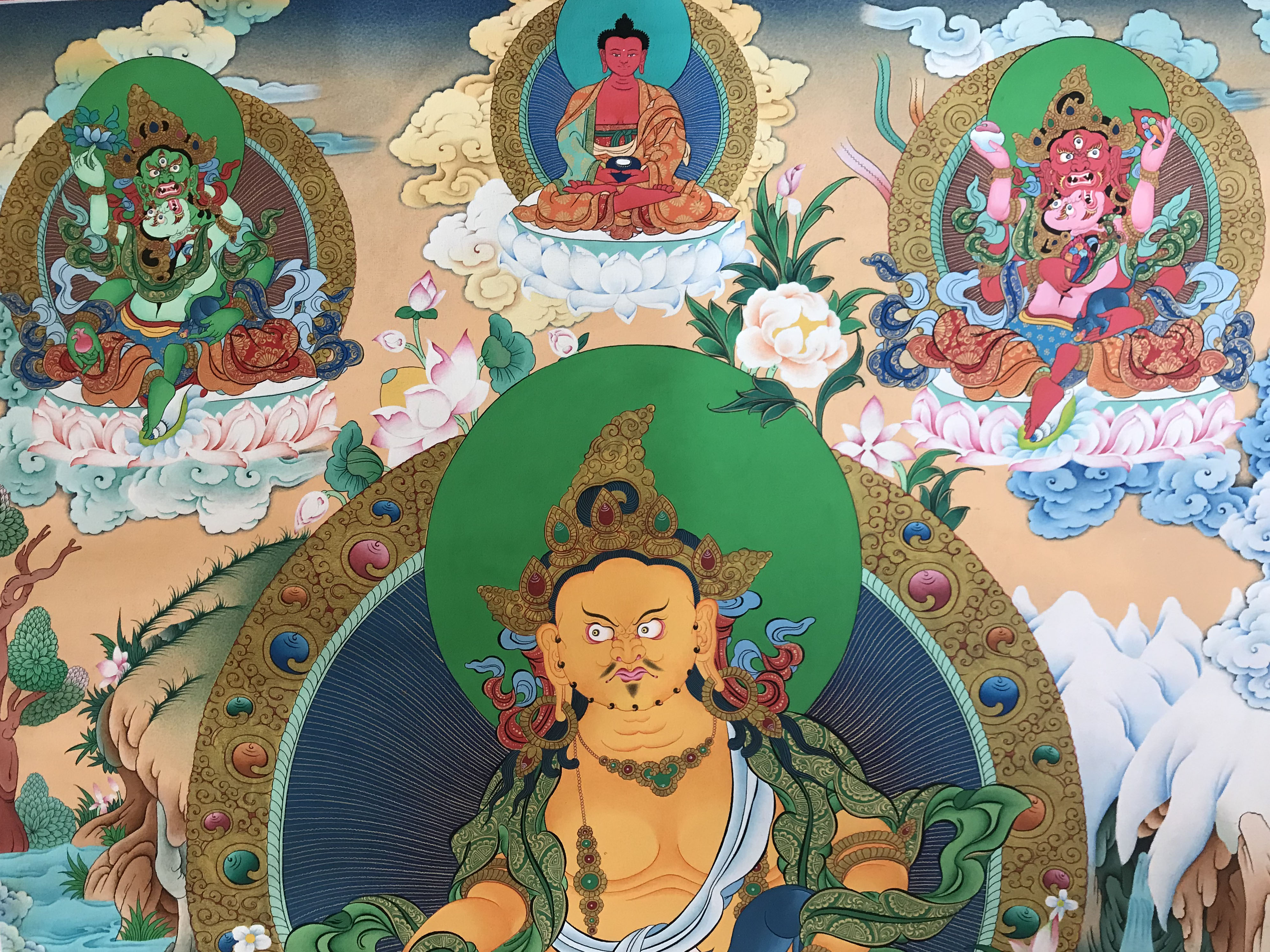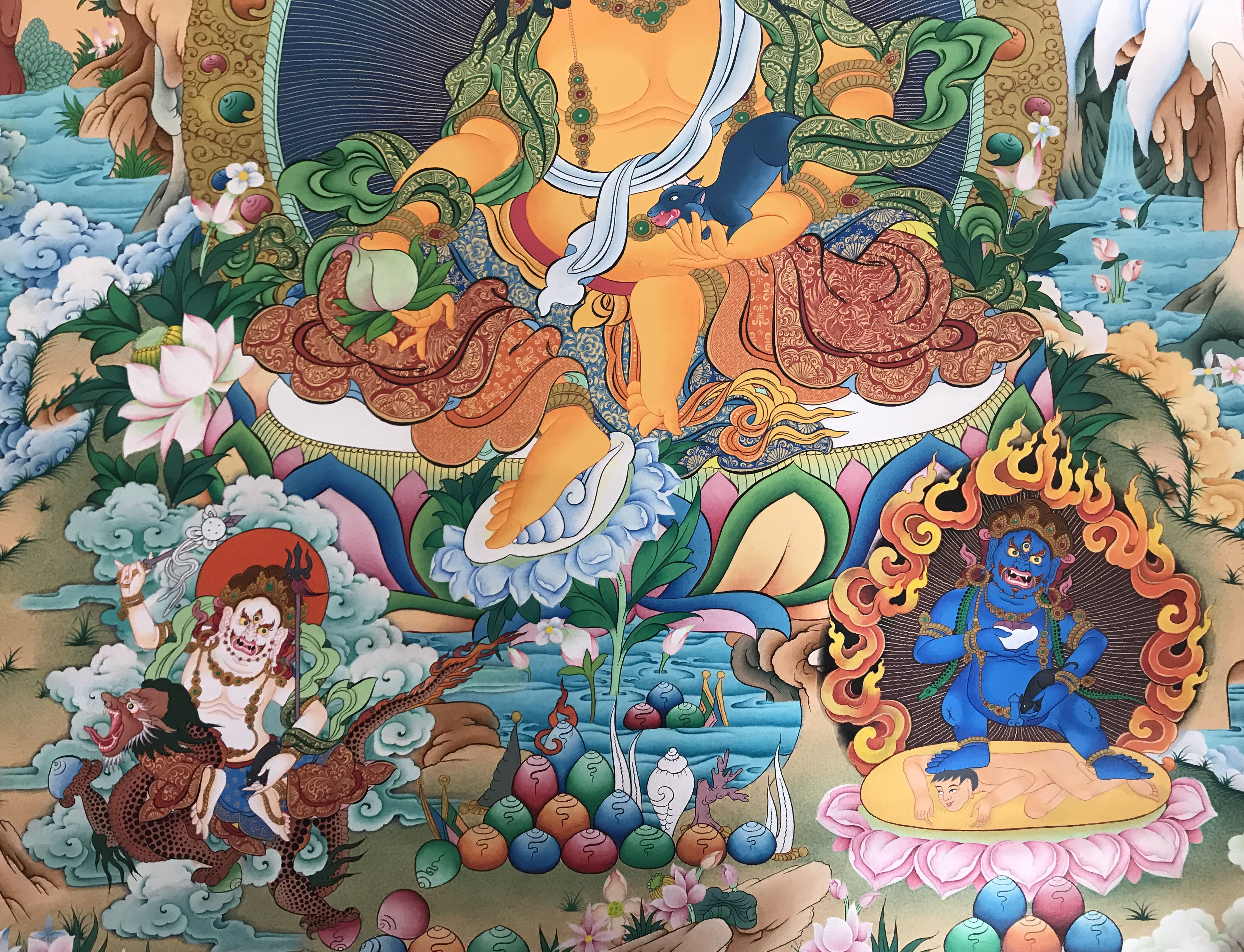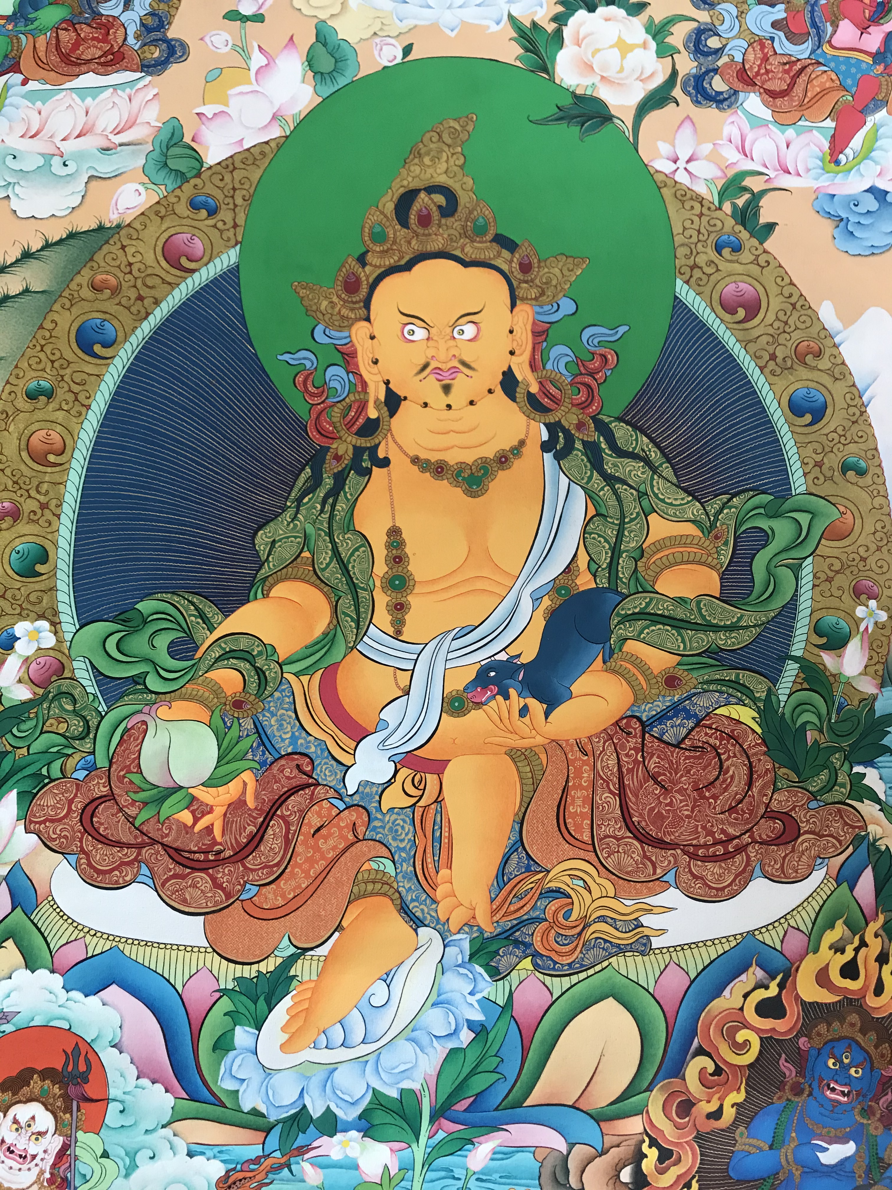 Jambhala is the protector of all linages and of all sentient beings from all sickness and difficulties. Jambhala is a bodhisattva of material and spiritual wealth as well as many other things, especially of granting financial stability. Jambhala is the god of wealth an appropriately a member of the jewel family. In Hindu mythology, Jhambhala is also known as Kubera. Jambhala is also believed to be an emanation of Avalokiteshavara or Chenrezig, the bodhisattva of compassion. There are five different wealth Jambhala, each has their own practice and mantra to help eliminate poverty and creates financial stability. He is usually shown sitting in the lotus, sun, and the moon disk. As with all of the Jambhala, he holds a mongoose in his left hand which produces jewels to give to the needy