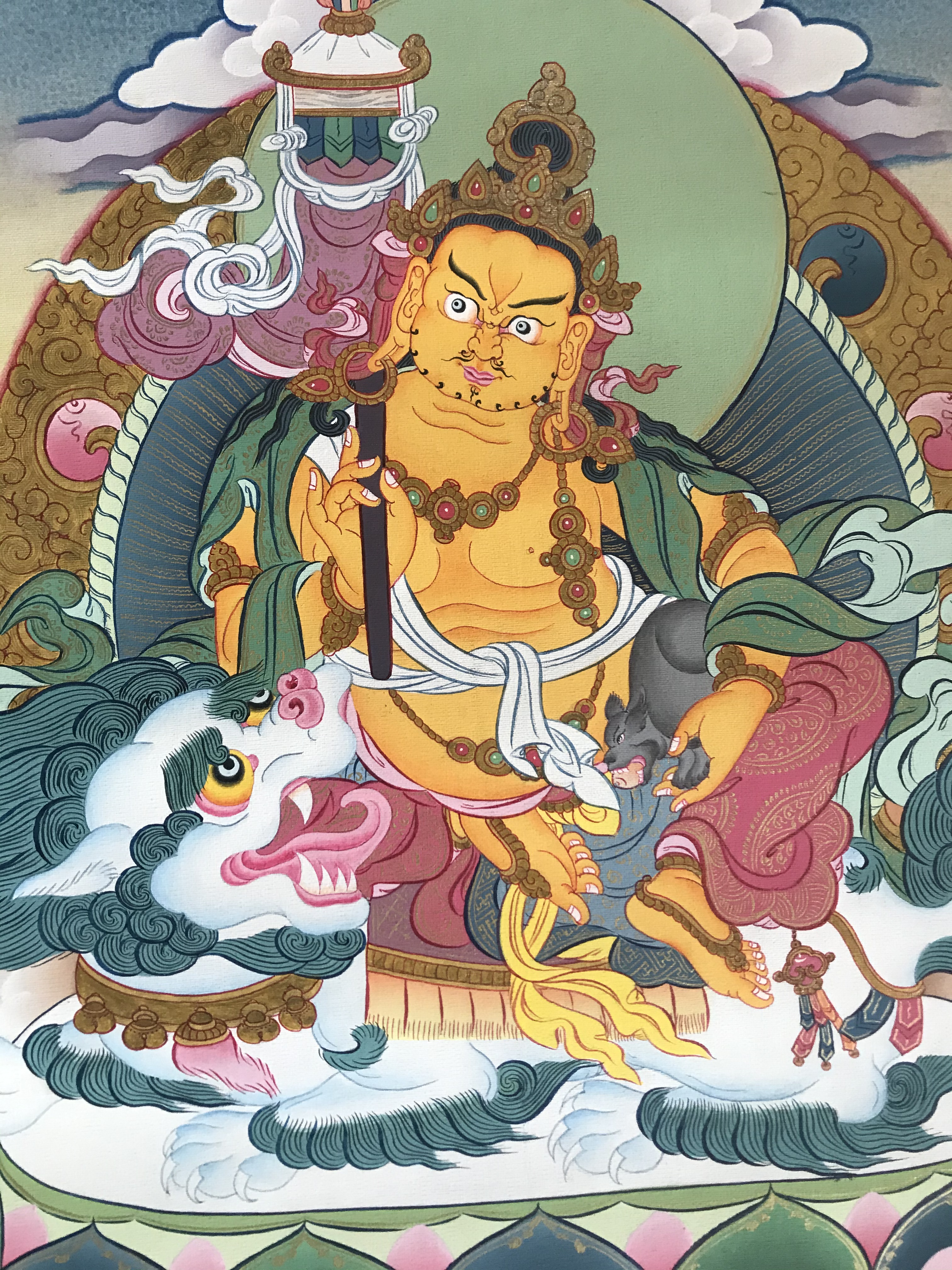 Zambhala is the protector of all linages and of all sentient beings from all sickness and difficulties. Zambhala is a bodhisattva of material and spiritual wealth as well as many other things, especially of granting financial stability. Zambhala is the god of wealth an appropriately a member of the jewel family. In Hindu mythology, Zambhala is also known as Kubera. Zambhala is also believed to be an emanation of Avalokiteshavara or Chenrezig, the bodhisattva of compassion. There are five different wealth Zambhala, each has their own practice and mantra to help eliminate poverty and creates financial stability. He is usually shown sitting in the lotus, sun, and the moon disk. As with all of the Zambhala, he holds a mongoose in his left hand which produces jewels to give to the need