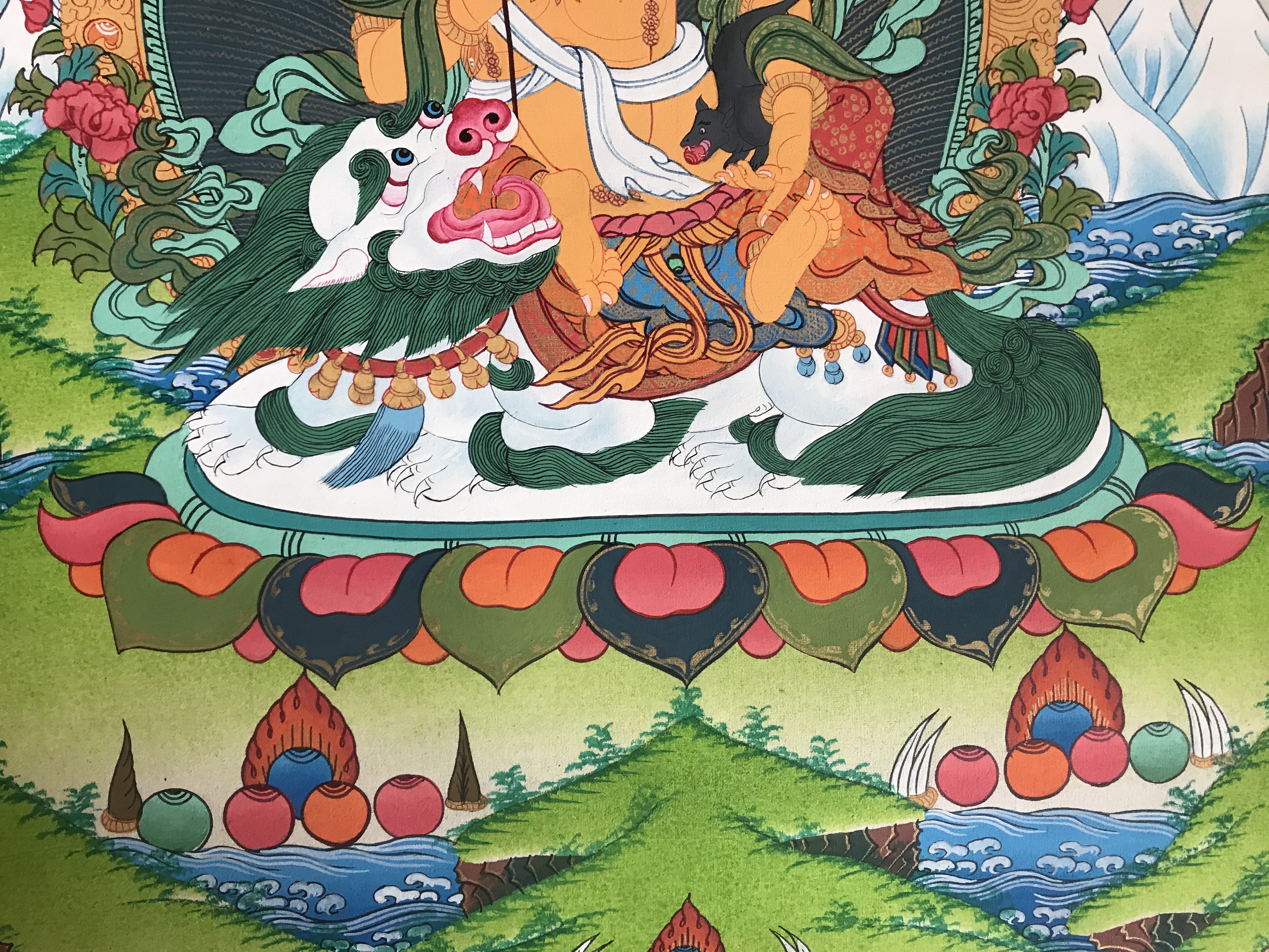 Zambhala is the protector of all linages and of all sentient beings from all sickness and difficulties. Zambhala is a bodhisattva of material and spiritual wealth as well as many other things, especially of granting financial stability. Zambhala is the god of wealth an appropriately a member of the jewel family. In Hindu mythology, Zambhala is also known as Kubera. Zambhala is also believed to be an emanation of Avalokiteshavara or Chenrezig, the bodhisattva of compassion. There are five different wealth Zambhala, each has their own practice and mantra to help eliminate poverty and creates financial stability. He is usually shown sitting in the lotus, sun, and the moon disk. As with all of the Zambhala, he holds a mongoose in his left hand which produces jewels to give to the need