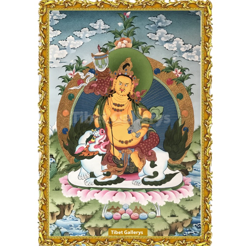 Zambhala is the protector of all linages and of all sentient beings from all sickness and difficulties. Zambhala is a bodhisattva of material and spiritual wealth as well as many other things, especially of granting financial stability. Zambhala is the god of wealth an appropriately a member of the jewel family. In Hindu mythology, Zambhala is also known as Kubera. Zambhala is also believed to be an emanation of Avalokiteshavara or Chenrezig, the bodhisattva of compassion. There are five different wealth Zambhala, each has their own practice and mantra to help eliminate poverty and creates financial stability. He is usually shown sitting in the lotus, sun, and the moon disk. As with all of the Zambhala, he holds a mongoose in his left hand which produces jewels to give to the need
