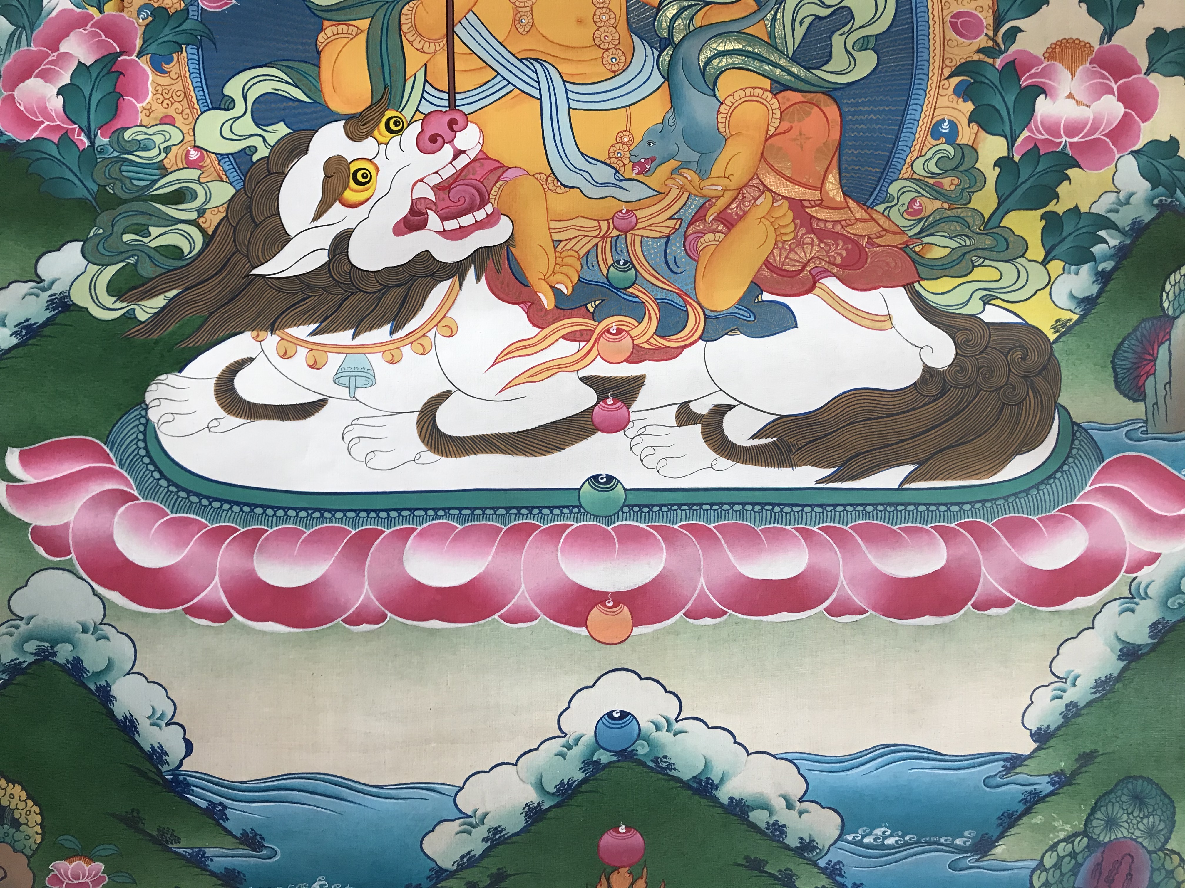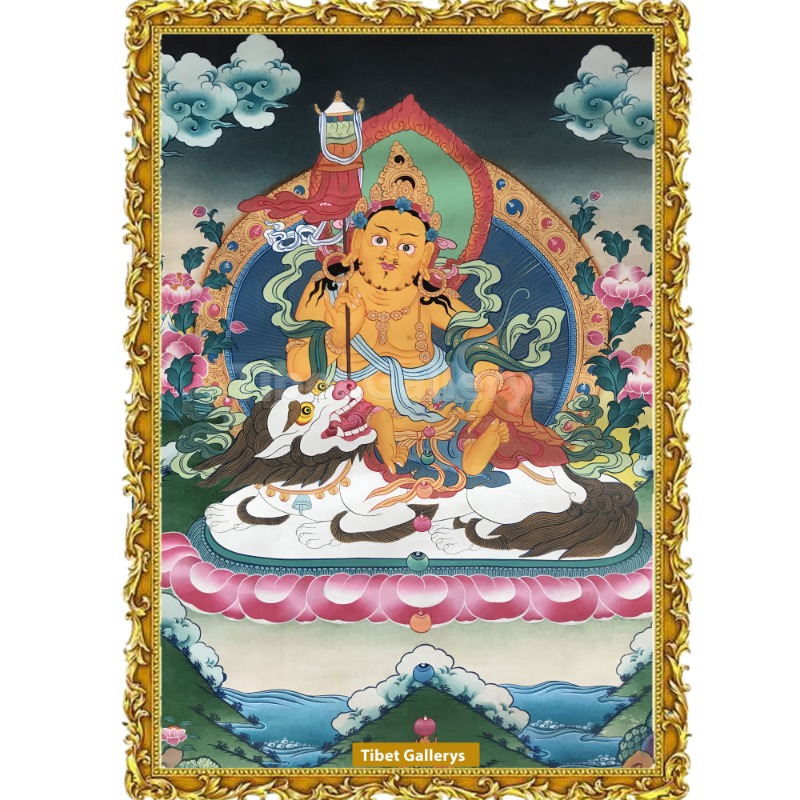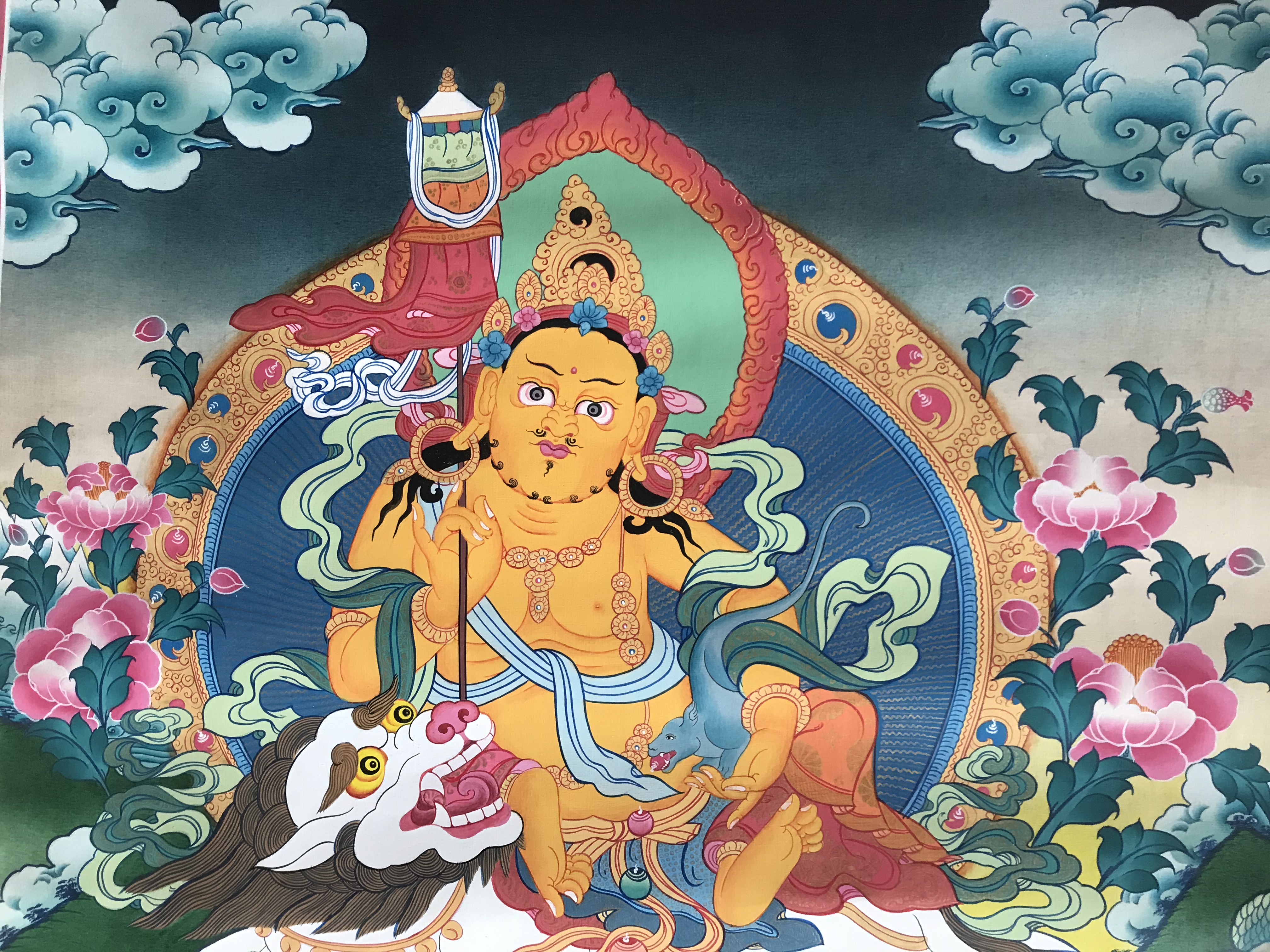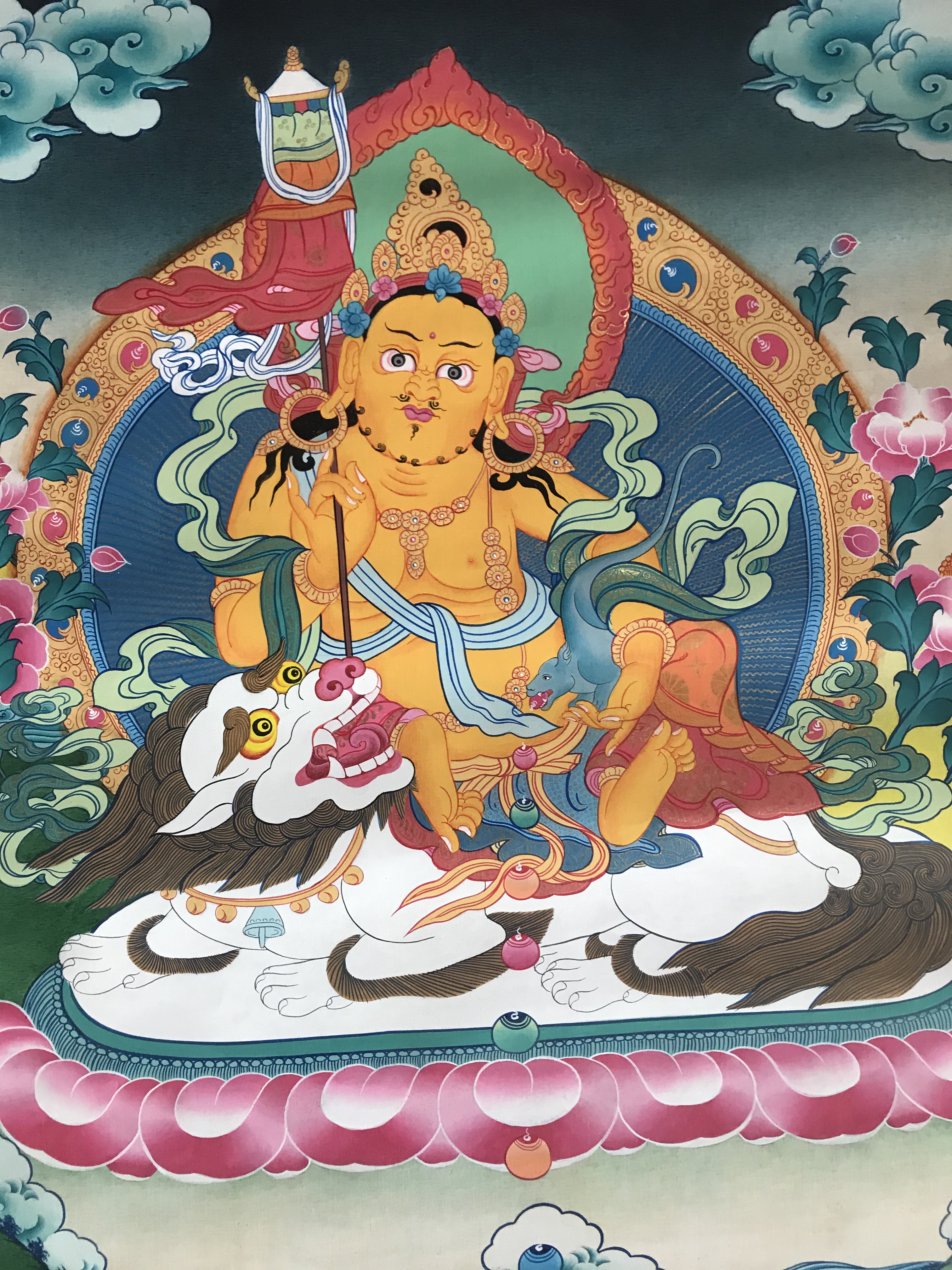 Zambhala is the protector of all linages and of all sentient beings from all sickness and difficulties. Zambhala is a bodhisattva of material and spiritual wealth as well as many other things, especially of granting financial stability. Zambhala is the god of wealth an appropriately a member of the jewel family. In Hindu mythology, Zambhala is also known as Kubera. Zambhala is also believed to be an emanation of Avalokiteshavara or Chenrezig, the bodhisattva of compassion. There are five different wealth Zambhala, each has their own practice and mantra to help eliminate poverty and creates financial stability. He is usually shown sitting in the lotus, sun, and the moon disk. As with all of the Zambhala, he holds a mongoose in his left hand which produces jewels to give to the need